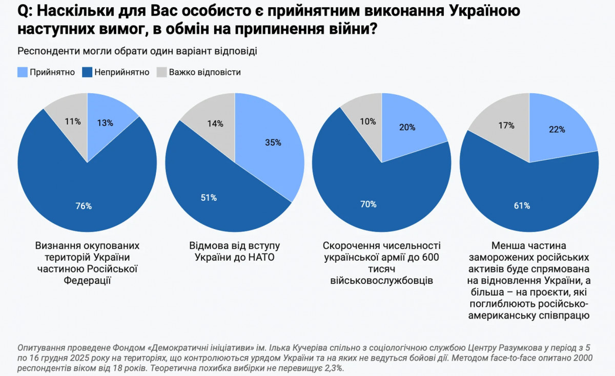 Фонд «Демократичні ініціативи» ім. Ілька Кучеріва провів всеукраїнське опитування спільно з соціологічною службою Центру Разумкова у період з 5 по 16 грудня 2025 року. Методом face-to-face було опитано 2000 респондентів віком від 18 років, які проживають на тих територіях, що контролюються урядом України та на яких не ведуться бойові дії. Теоретична похибка вибірки не перевищує 2,3%.
