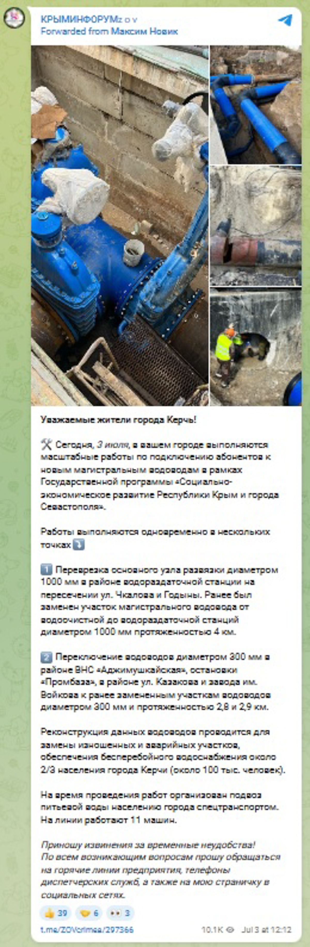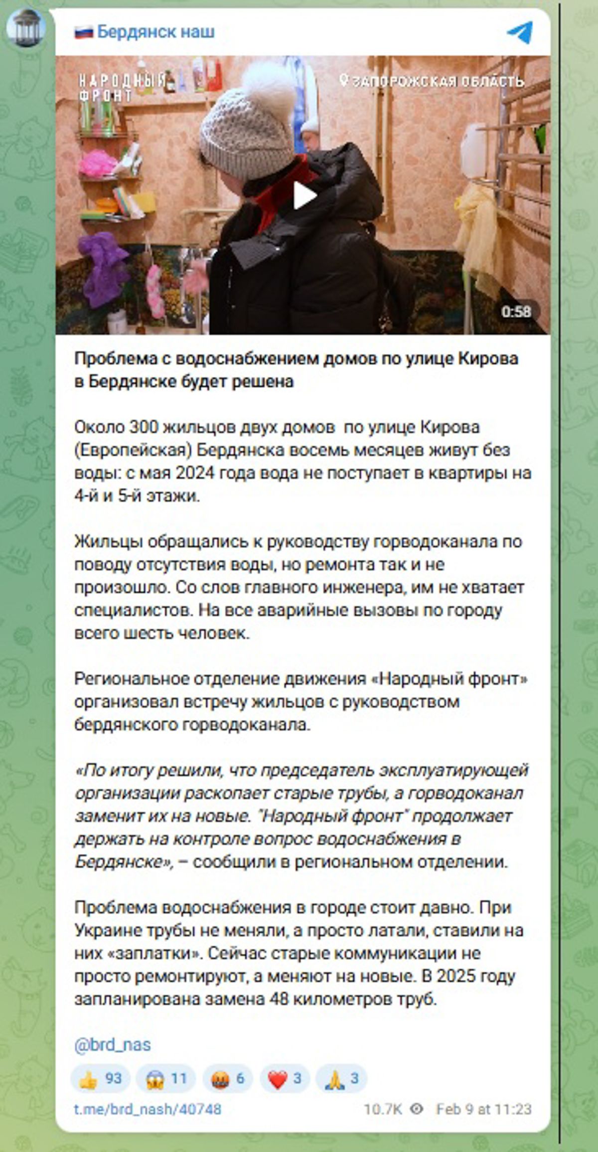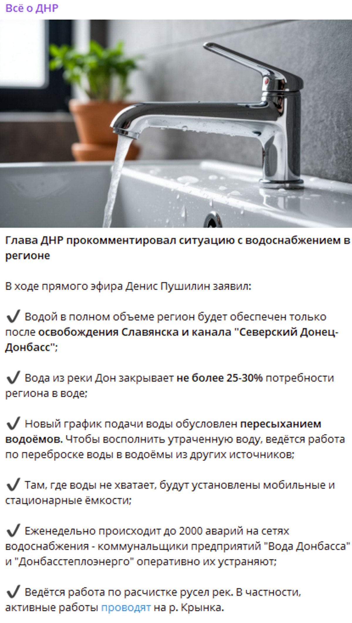 У російських і пропагандистських телеграм-каналах проблеми тимчасово окупованих територій України здебільшого замовчують. Якщо про них і розповідають, то рапортують про внесок росіян чи корупційних чиновників у спроби їх розв’язання чи дають рецепти з подолання труднощів, на кшталт того як розставляли баки для збору води у Донецьку.