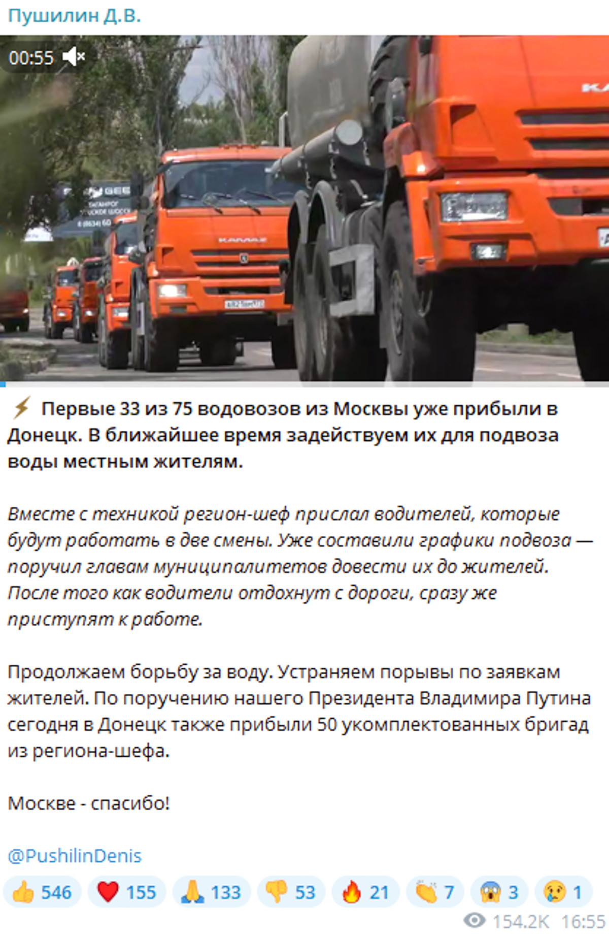 Скрин із телеграм-каналу «Пушилін Д.В.» (87 тис. підписників)
