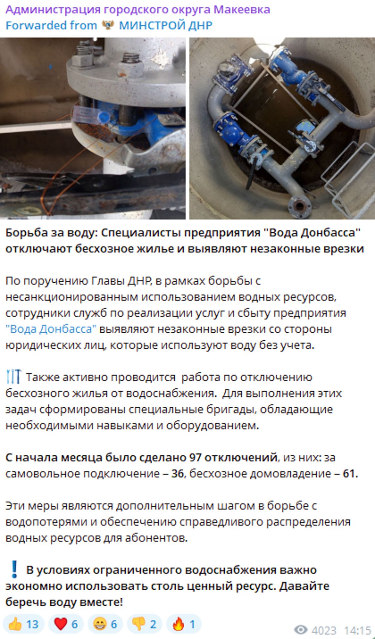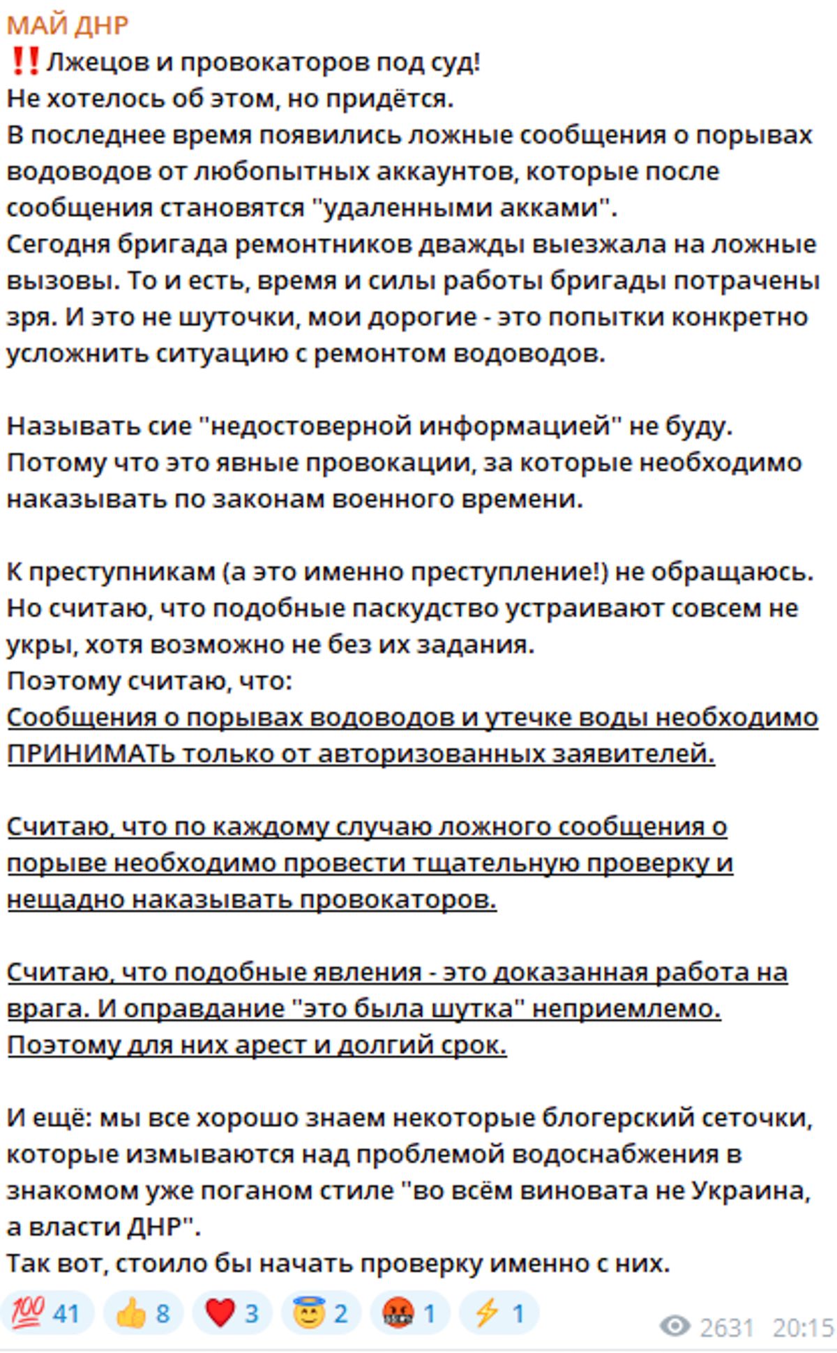 Також просуваються тези про необхідність боротьби з «внутрішніми ворогами», які нібито заважають відновити водопостачання. Повідомляють про активні дії щодо «виявлення незаконних врізок» до комунальних систем, а також до цієї ж теми чомусь включається пошук «безхазяйного» житла, хоча невідомо, яким чином житло, в якому ніхто не живе, витрачає воду. (Детальніше про визнання житла «безхазяйним» як засіб конфіскації майна місцевих мешканців окупантами читайте в попередньому дослідженні). Зустрічаються навіть повідомлення, в яких вимагають шукати та карати «провокаторів», які подають фейкові заявки про прориви труб.