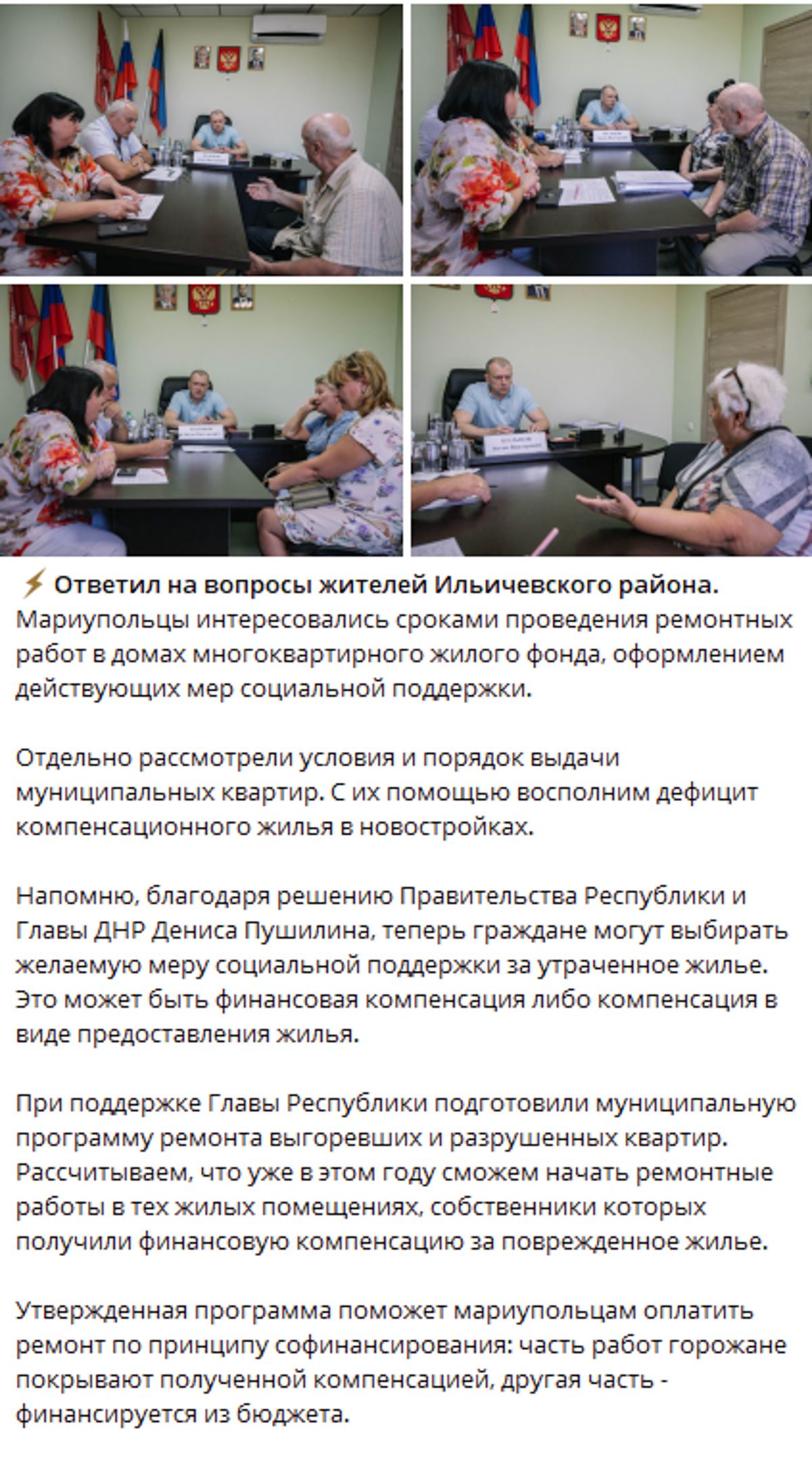 Одним із найбільш постраждалих від окупантів міст області є Маріуполь. Попри активну пропаганду з боку окупантів про те, що місто відбудовується і там постійно зводять нові будинки, в медіапростір тим не менш потрапляють згадки про дефіцит житла в місті для тих місцевих жителів, які втратили власні домівки під час облоги та штурму Маріуполя. В таких повідомленнях стверджується, що постраждалі отримають квартири з «муніципального фонду», хоча замовчується, що цей «фонд» поповнюють, конфіскуючи законну власність інших жителів міста.