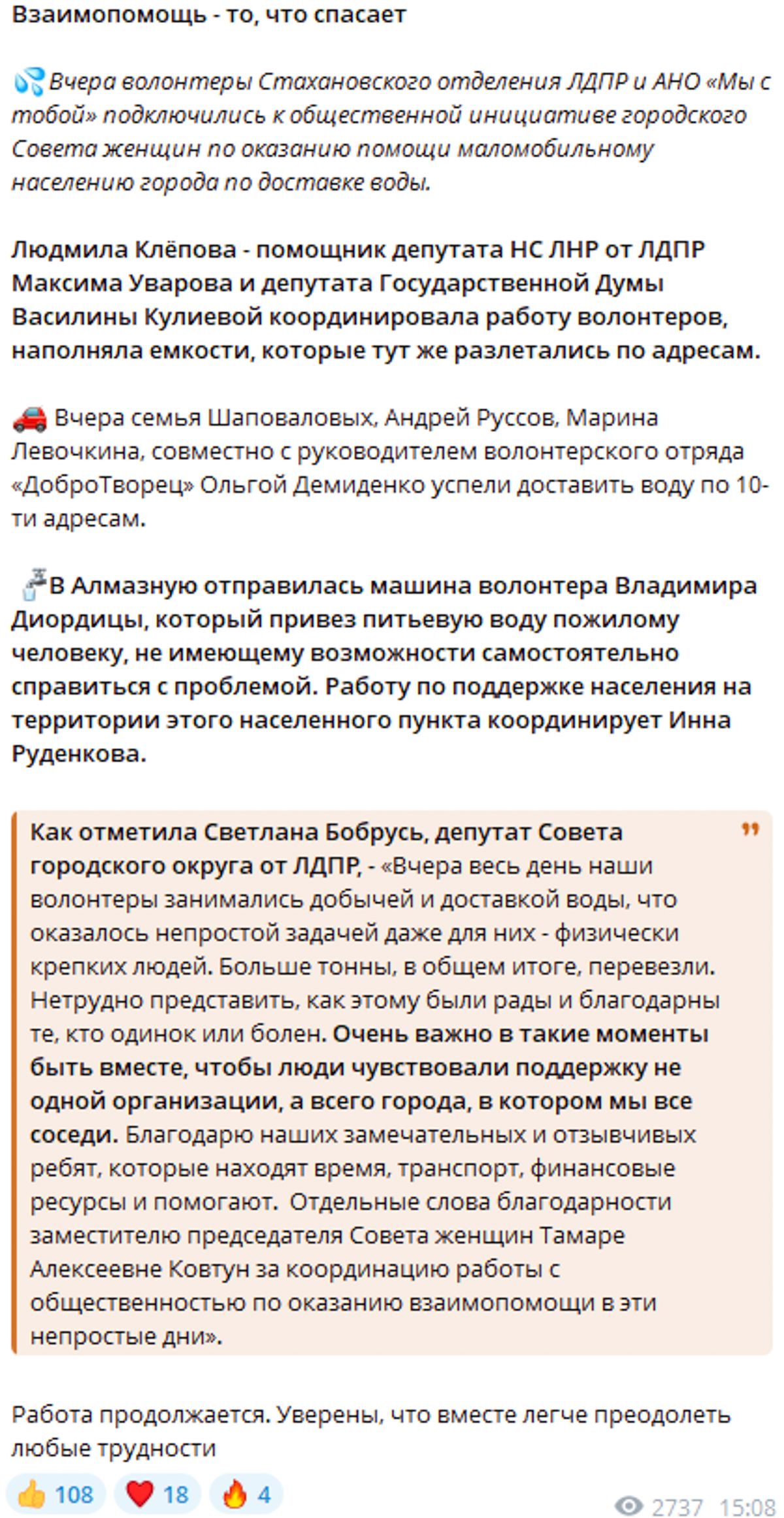 Пропагандистські медіа рясніють повідомленнями про участь «волонтерів» від російських «патріотичних» рухів і політичних партій у подоланні наслідків аварій і доставленні води місцевим жителям. Окупанти власними діями створили ситуацію, за якої нормальне функціонування комунальних мереж є неможливим, і на цьому фоні користуються можливістю похвалитися своєю «благодійністю». Місцевих жителів примусово поставили в ситуацію, де вони змушені користуватися «допомогою» росіян, або не залишатися без базових благ.