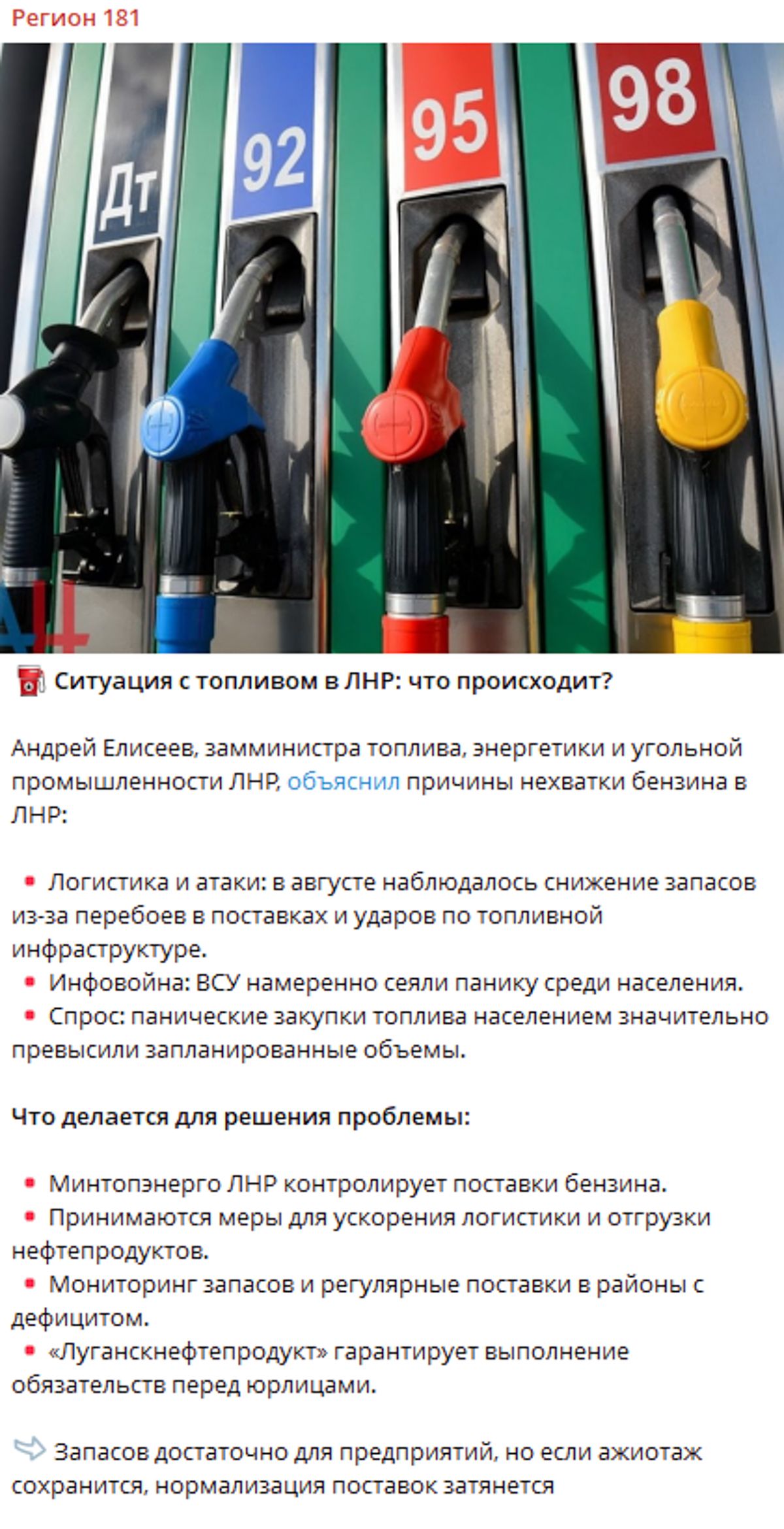 Крім комунальних проблем, у Луганській області, як і в інших областях, повідомлялося про дефіцит бензину. Цю проблему подавали разом із коментарями представників окупаційної адміністрації, які визнавали наявний дефіцит, проте робили наголос на «контрольованості» ситуації.
