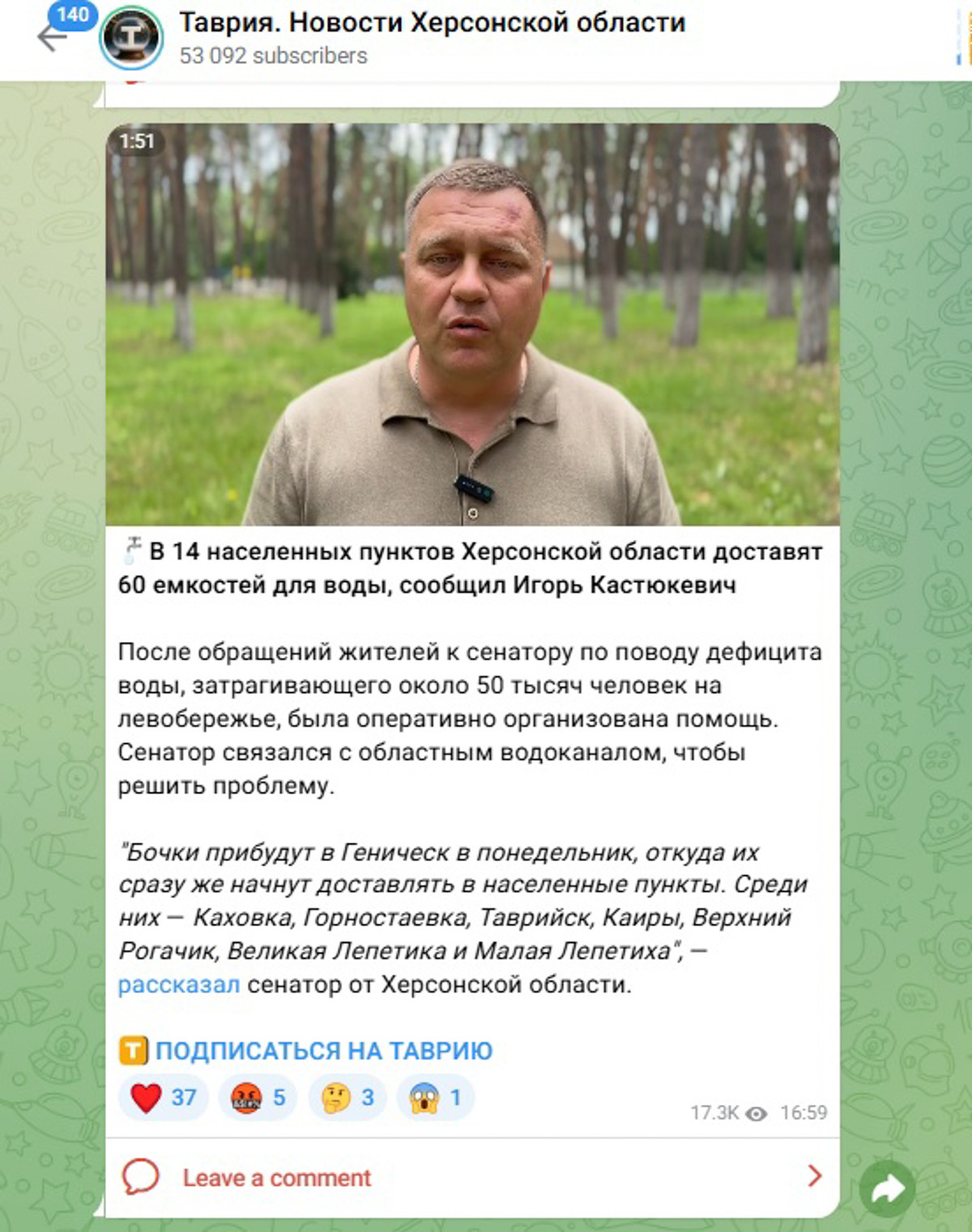 Скрин із телеграм-каналу «Таврия. Новости Херсонской области» (53 тис. підписників)