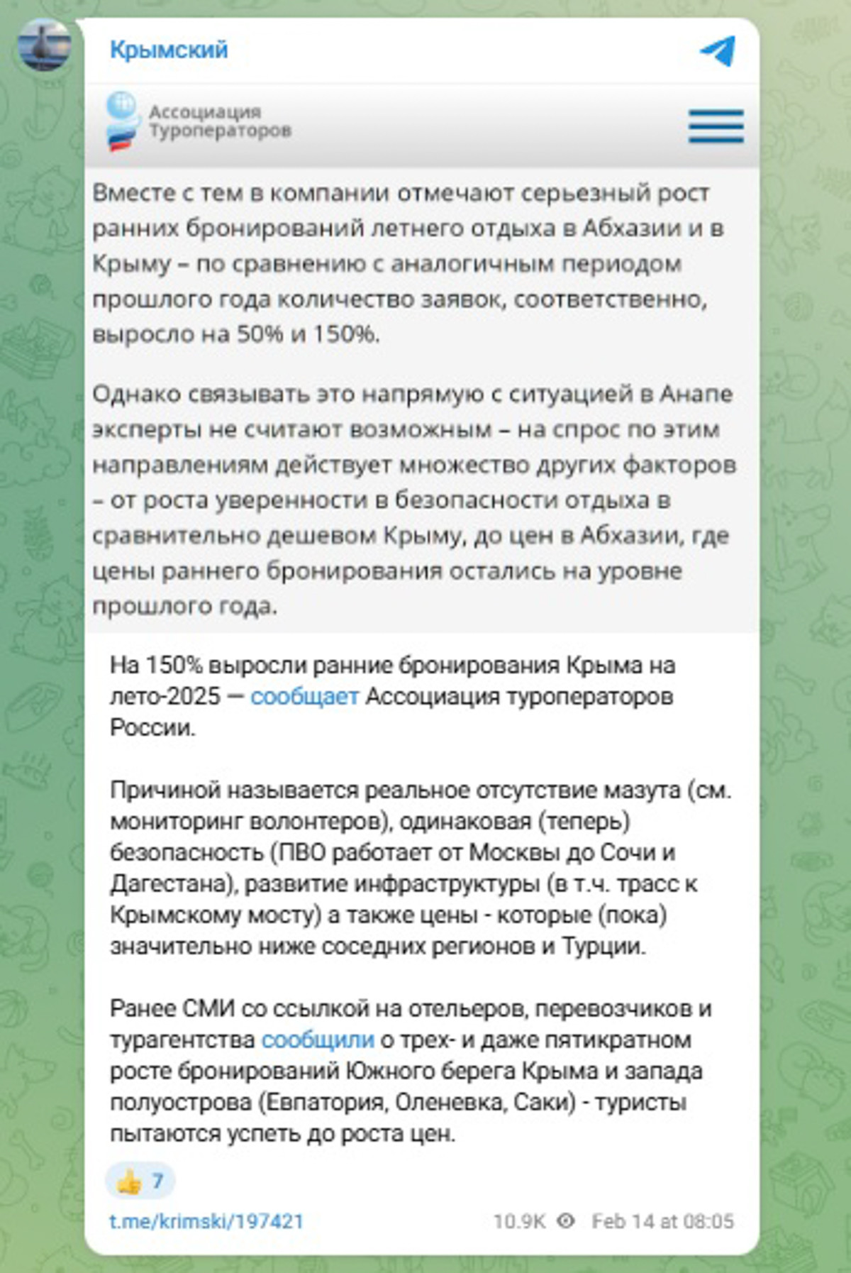 Зростання бронювань, кількість туристів, нові готелі й розвиток сервісу використовуються як універсальний доказ того, що регіон не перебуває у стані дефіциту чи занепаду. Риторично туризм легітимує окупацію через «попит»; нівелює розмови про безпеку; перекриває інші соціальні проблеми. Навіть екологічні ризики або інфраструктурні обмеження в курортний сезон подаються не як загроза, а як інформаційні атаки з боку України. Таким чином, будь-яка критика автоматично маркується як фейк, спрямований на підрив туристичного іміджу.