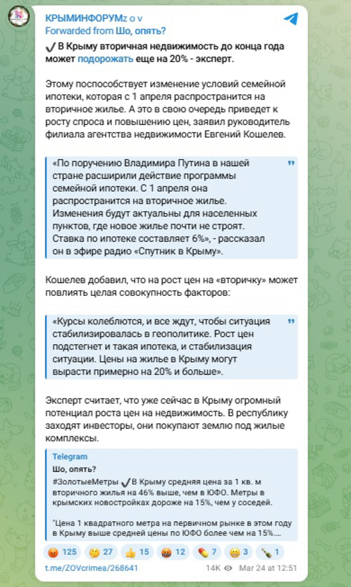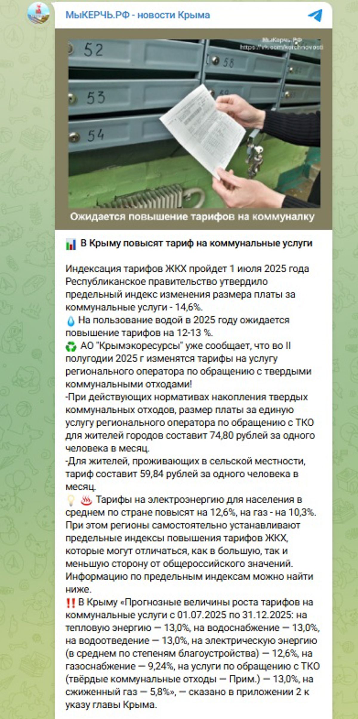 Телеграм-канали, що висвітлюють соціально-економічну ситуацію в окупованому Криму, демонструють дещо іншу риторичну модель порівняно з прифронтовими регіонами на кшталт Запорізької чи Херсонської областей. Якщо там дефіцит подається як неминучий наслідок війни й обстрілів, то у випадку Криму домінує стратегія демонстрування дефіциту як варіанту нормального стану. Проблеми визнають, але системно знецінюють. Увагу від них намагаються відвернути риторикою про потенційні інвестиції та зростання.
