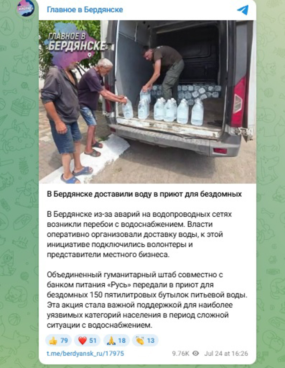 У ситуаціях гострого дефіциту (вода, електрика) у пропагандистських телеграм-каналах, націлених на жителів ТОТ, повідомляють про гуманітарні чи благодійні заходи: доставлення бутильованої води, залученість волонтерів, бізнесу, гуманітарних штабів. Такі повідомлення виконують компенсаторну функцію: маскують відсутність системного розв’язання кризових ситуацій.