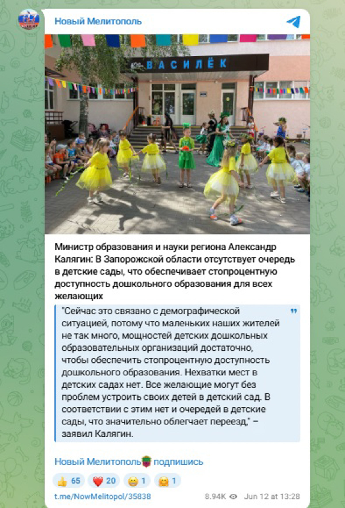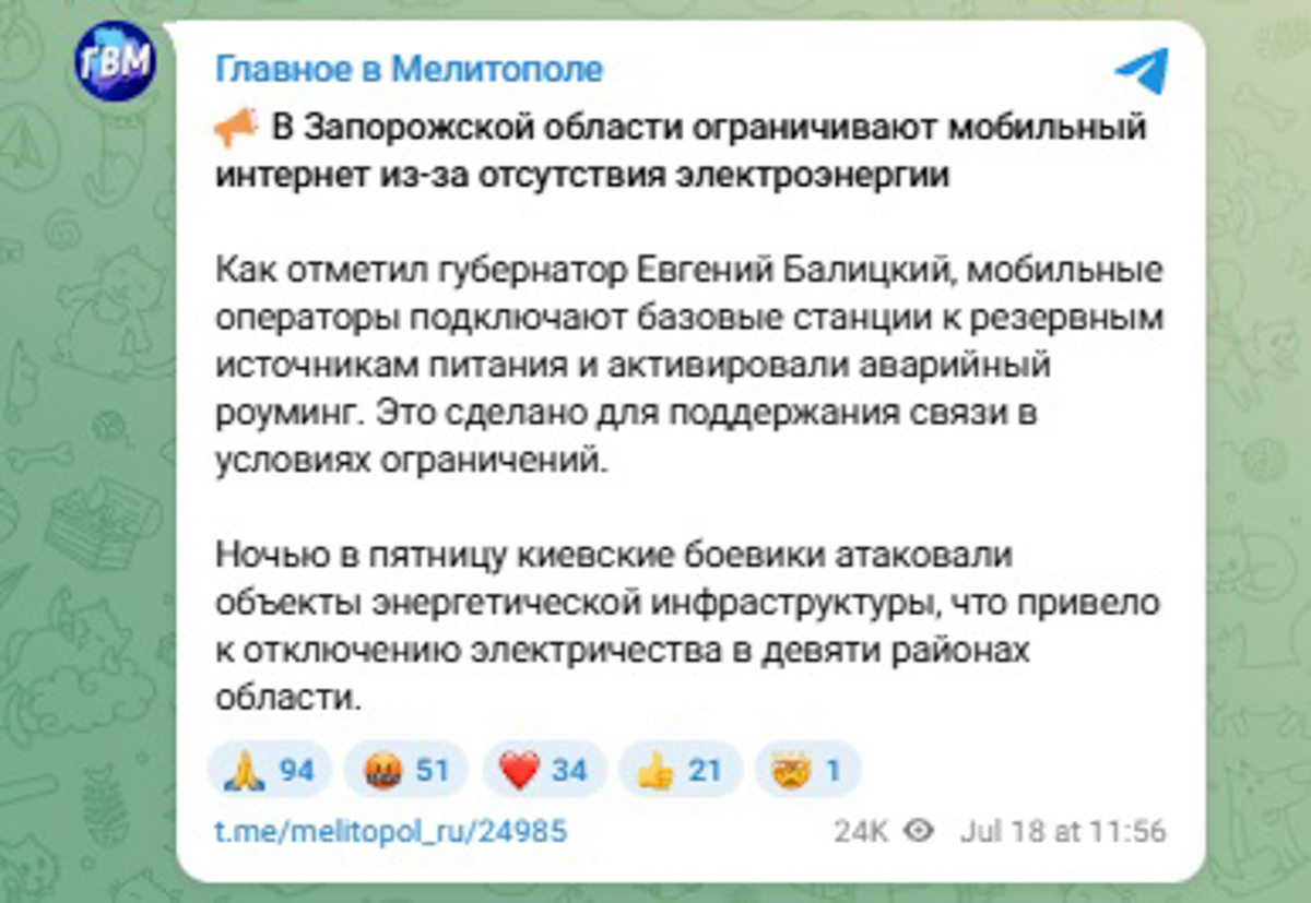 Скрин допису телеграм-каналу «Новый Мелитополь» (30 тис підписників)