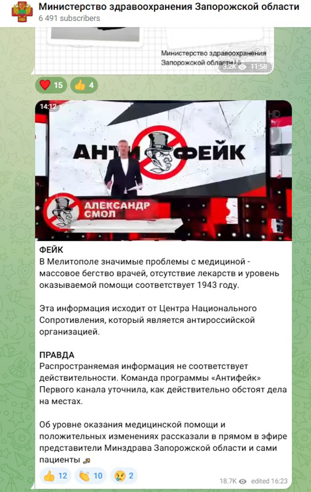 Скрин допису телеграм-каналу «Министерство здравохранения Запорожской области» (6 тис підписників)