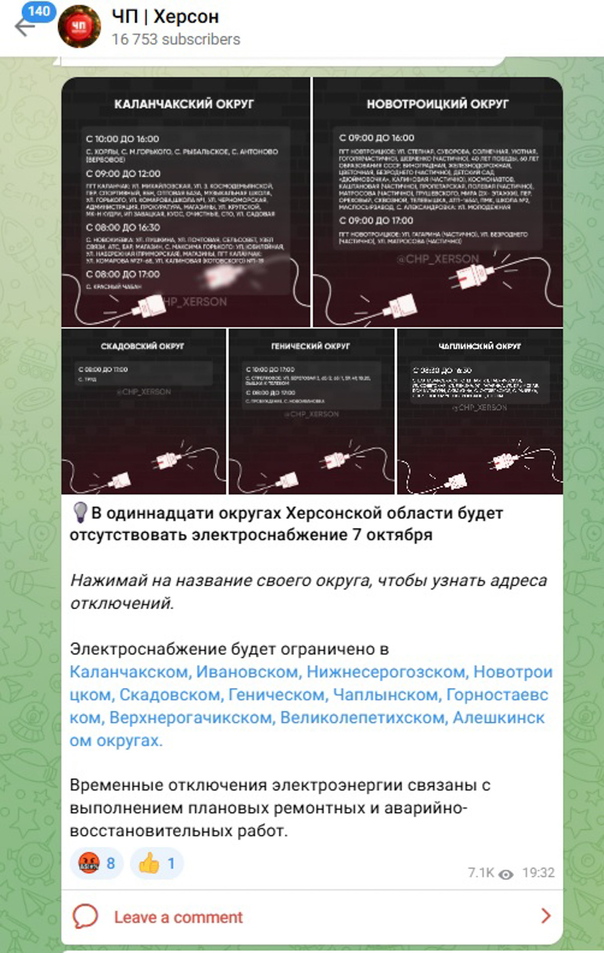 Риторично важливо, що відсутність базових послуг майже ніколи не маркується як критична ситуація. Навіть тривалі відімкнення або повна відсутність електроенергії в окремих громадах подаються як свого роду технічна деталь, що потребує «розуміння» з боку місцевих жителів. Населення системно закликають «зберігати спокій», «поставитися з розумінням» і чекати на відновлення, без конкретизації можливих термінів цього відновлення.