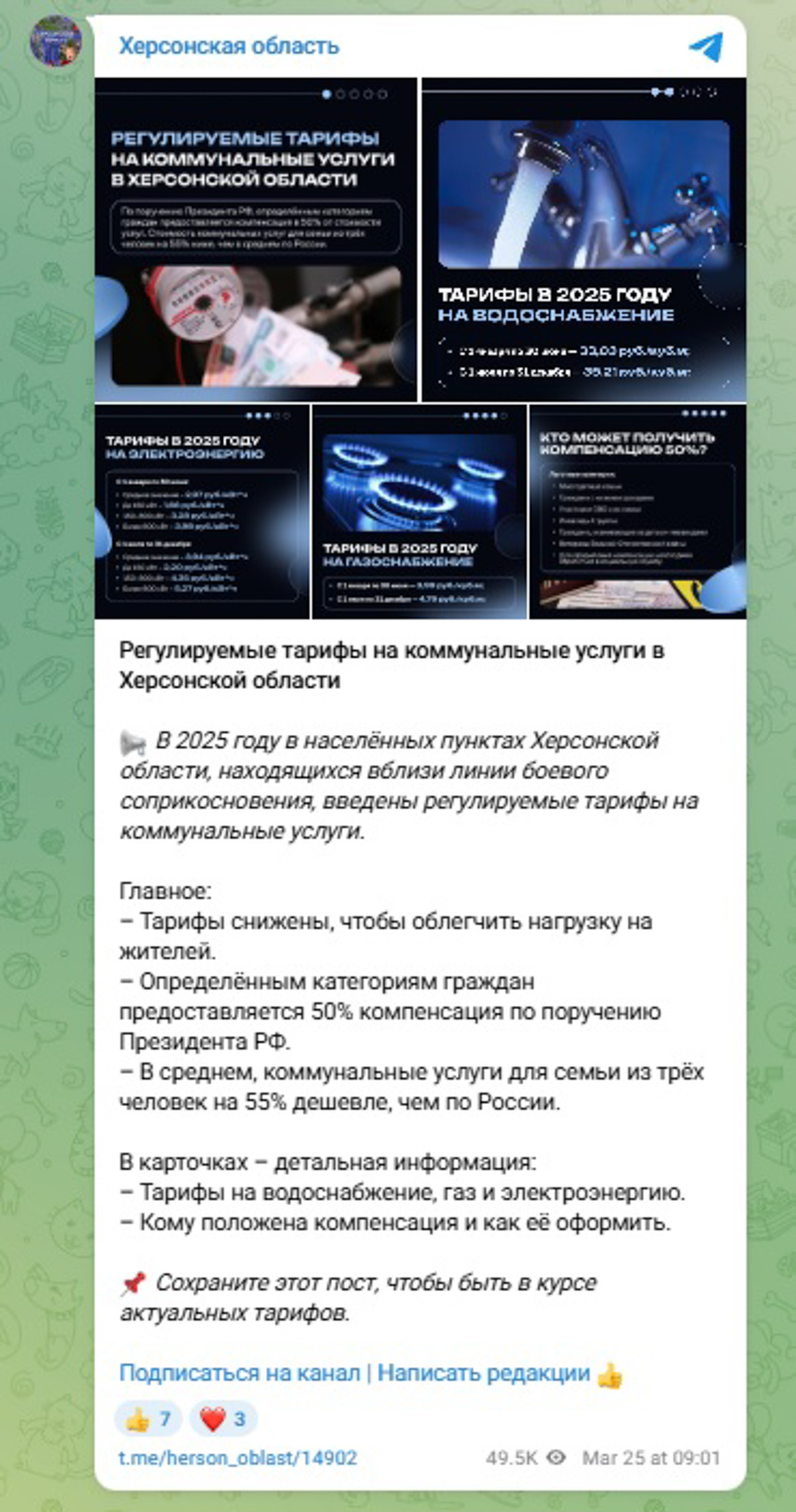 Економічне життя Херсонщини в телеграм-каналах постає як адміністративно підтримуване існування, а не самодостатній розвиток. Повідомлення про регулювання цін, безплатні торгові місця, контроль за тарифами формують образ економіки, що функціонує завдяки постійному втручанню влади.