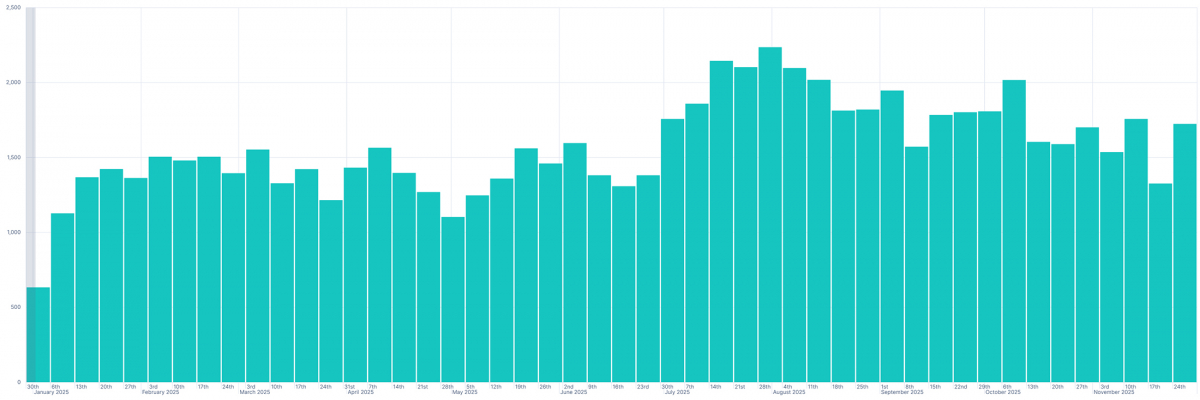 Потижнева динаміка вживання ключових слів у публікаціях із телеграм-каналів, створених протягом 1 січня — 30 листопада 2025 року, які надала компанія LetsData. Джерело: LetsData