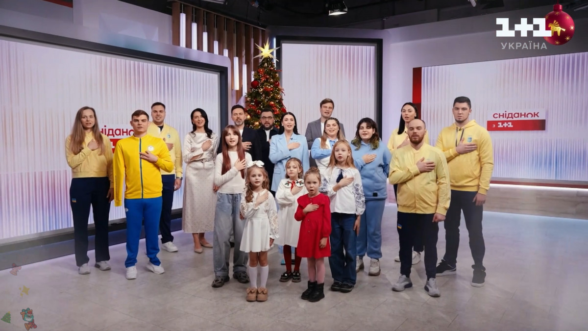 «1+1 Україна» показував «Новорічний Вечірній квартал», а після привітання президента на каналі увімкнули гімн у виконанні ведучих, журналістів та учасників різних шоу телеканалу, зокрема «Вечірній квартал», «Танці з зірками», ТСН, «Сніданок з 1+1». Разом з журналістами гімн заспівали діти, спортсмени та військовослужбовці.