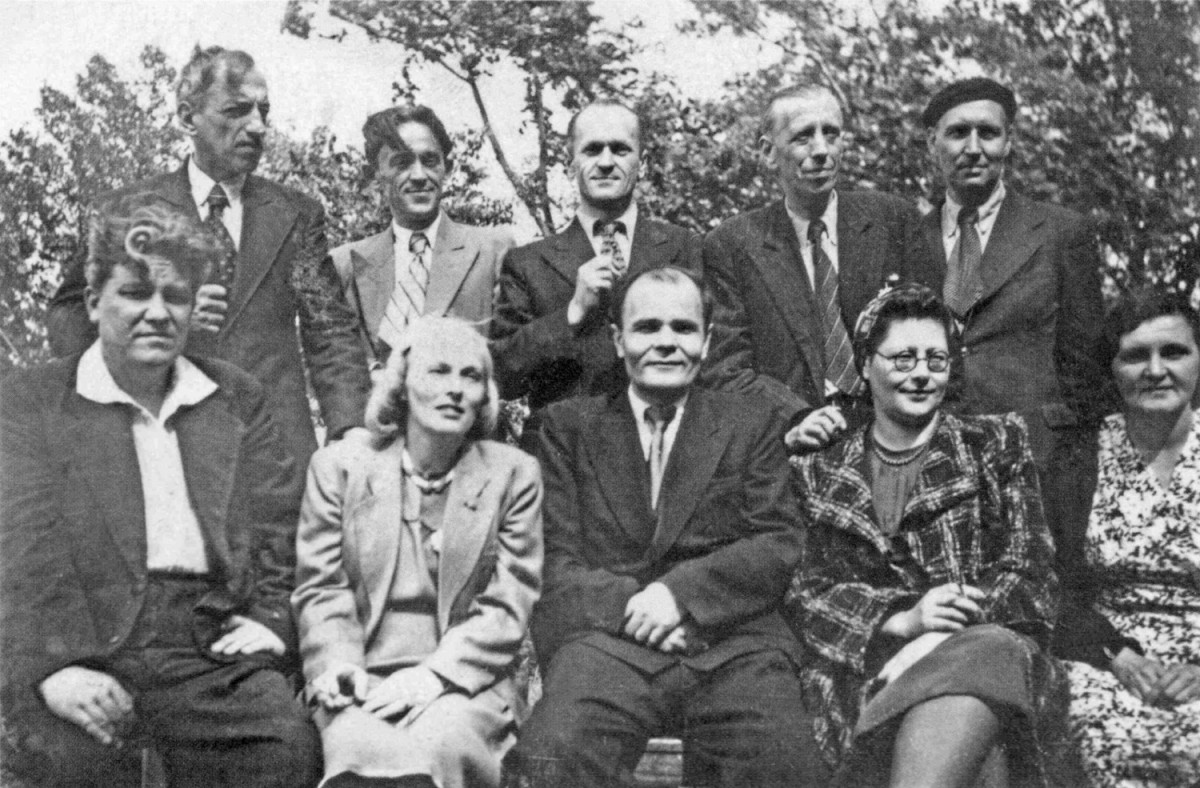 Після присвоєння почесних звань. Сидять, зліва направо: Петро Поляков (диригент радіооркестру), Лідія Лєсная (режисерка, актриса дитячого мовлення), Яків Сірченко (голова Радіокомітету), Євгенія Круглова та Наталя Савицька (дикторки). Стоять, зліва направо: Борис Лятошинський (художній керівник музичного мовлення), Юрій Таранченко (диригент радіохору), Борис Пономаренко (художній керівник музичних колективів), Олександр Крижевський (режисер), Михайло Романов (драматичне мовлення). Київ, травень 1946 р. Журнал «Музика» №3—5, 2015