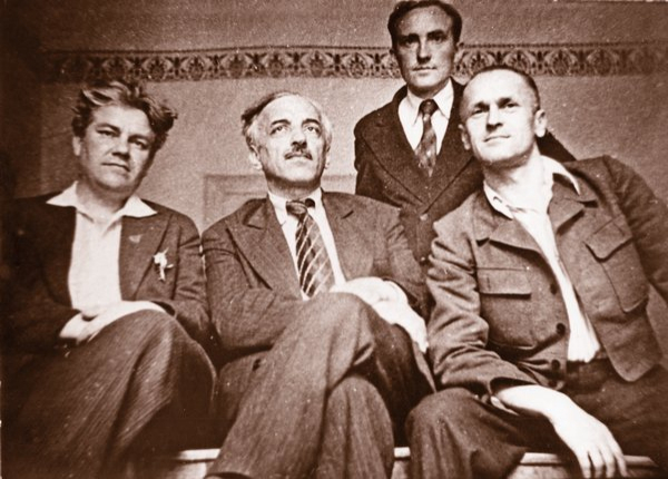 Диригент Симфонічного оркестру Українського радіо Петро Поляков, композитори Борис Лятошинський і Олександр Зноско-Боровський (стоїть), диригент Борис Пономаренко у стінах Українського радіокомітету, 1940-ві роки. Журнал «Музика» №3—5, 2015