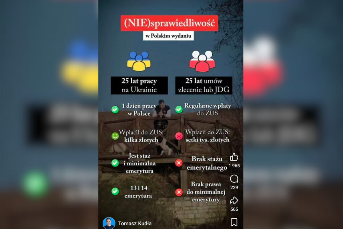 Поляків переконували, що українцю достатньо відпрацювати один день, маючи 25 років стажу в Україні, аби претендувати на польську мінімальну пенсію. А полякам 25 років замало навіть за умови виплат соціальних внесків. І тут мільйонні перегляди, обурення і поширення, де тільки можна. Знову соціальний біль, в який не втомлюються бити пропагандисти. Мовляв, українці «паразитують» на усьому готовому.