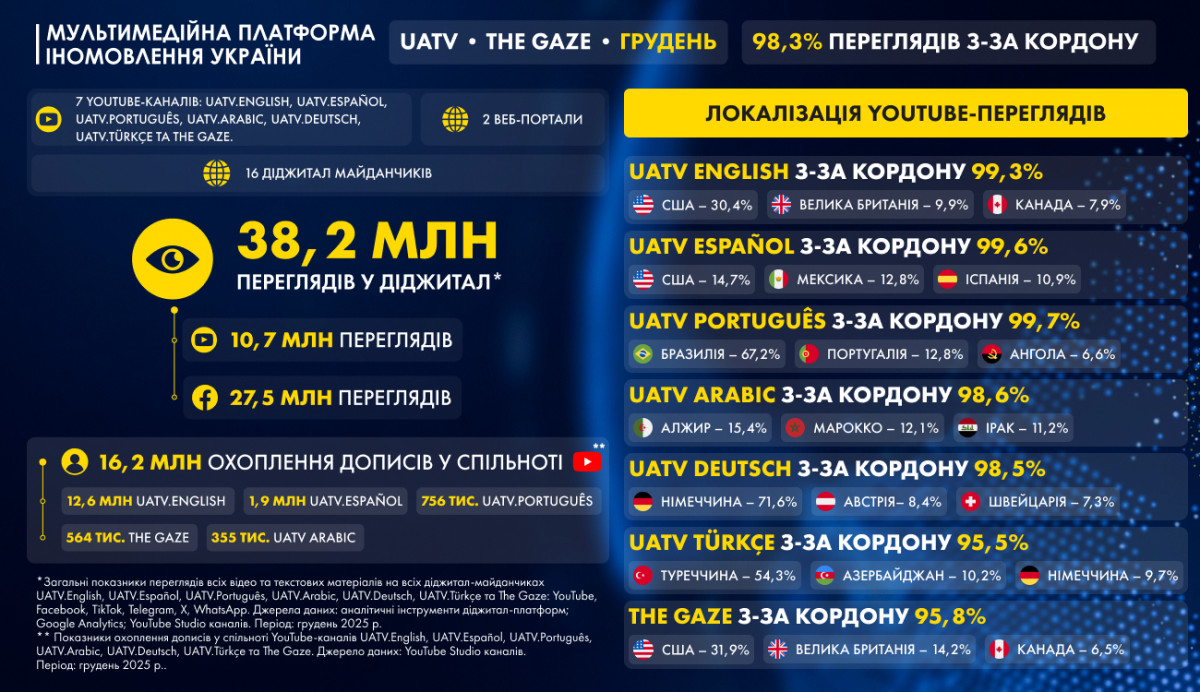 * Загальні показники переглядів всіх відео та текстових матеріалів на всіх діджитал-майданчиках UATV.English, UATV.Español, UATV.Português, UATV.Arabic, UATV.Deutsch, UATV.Türkçe та The Gaze: YouTube, Facebook, TikTok, Telegram, Х, WhatsApp. Джерела даних: аналітичні інструменти діджитал-платформ; Google Analytics; YouTube Studio каналів. Період: грудень 2025 р.