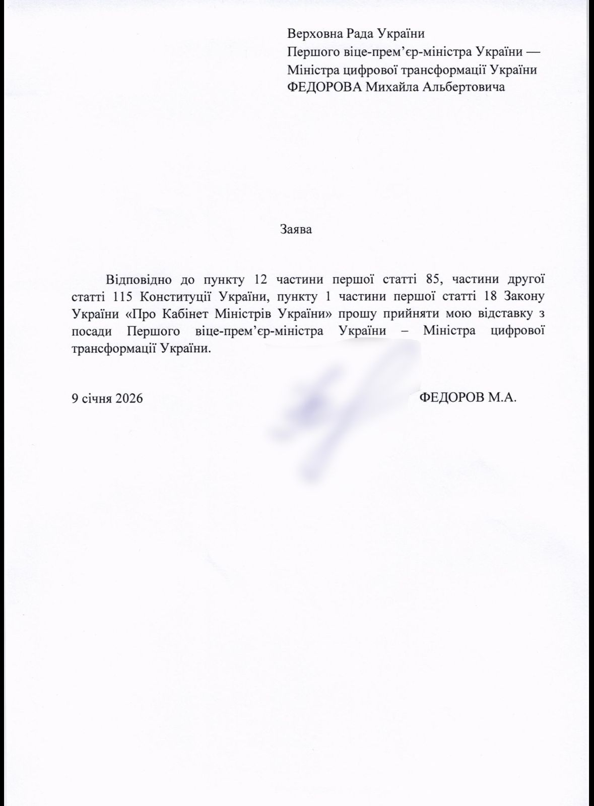 До Верховної Ради надійшли заяви про відставку від міністра оборони Дениса Шмигаля та першого віцепрем’єр-міністра — міністра цифрової трансформації Михайла Федорова. Про це на своїй фейсбук-сторінці повідомив спікер парламенту Руслан Стефанчук.