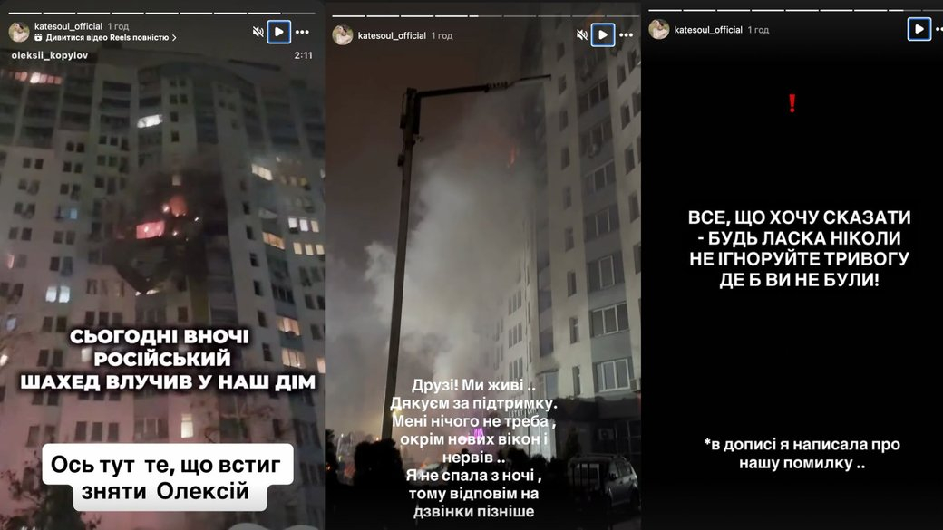 Катерина Коваленко опублікувала інстаграм-допис, у якому розповіла, що «шахед» влучив на поверх вище від її квартири. У будинку співачки вилетіли всі вікна. Вона також повідомила, що після приїзду служб ДСНС російські дрони атакували знову.