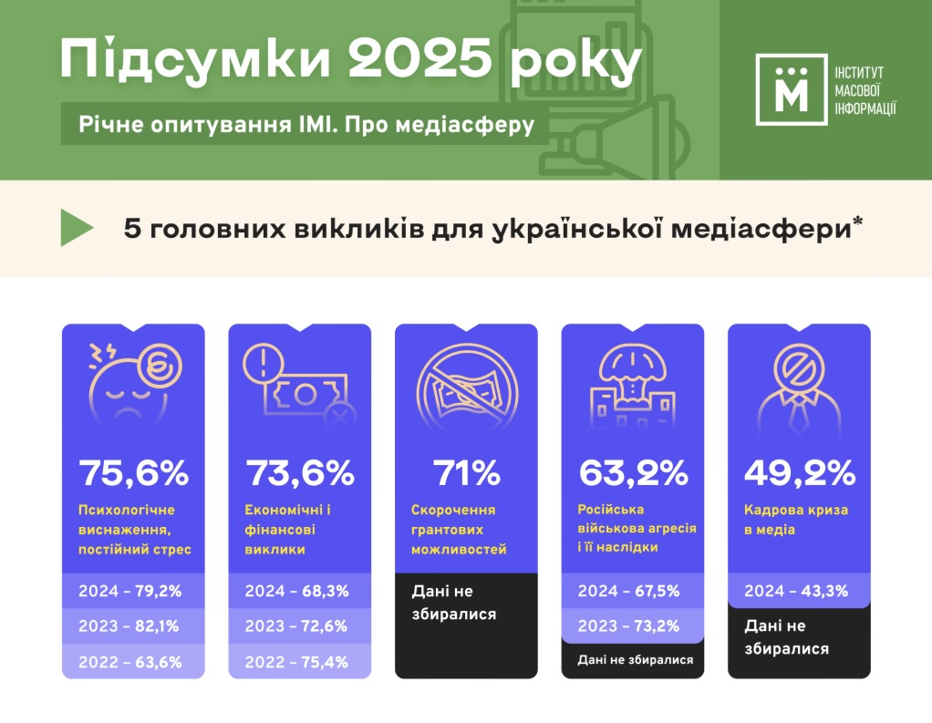 Психологічне виснаження і постійний стрес, фінансові проблеми, російська військова агресія і криза кадрів стали головними викликами для медіа у 2025 році. Про це свідчать результати опитування, яке провів Інститут масової інформації, повідомила пресслужба організації.