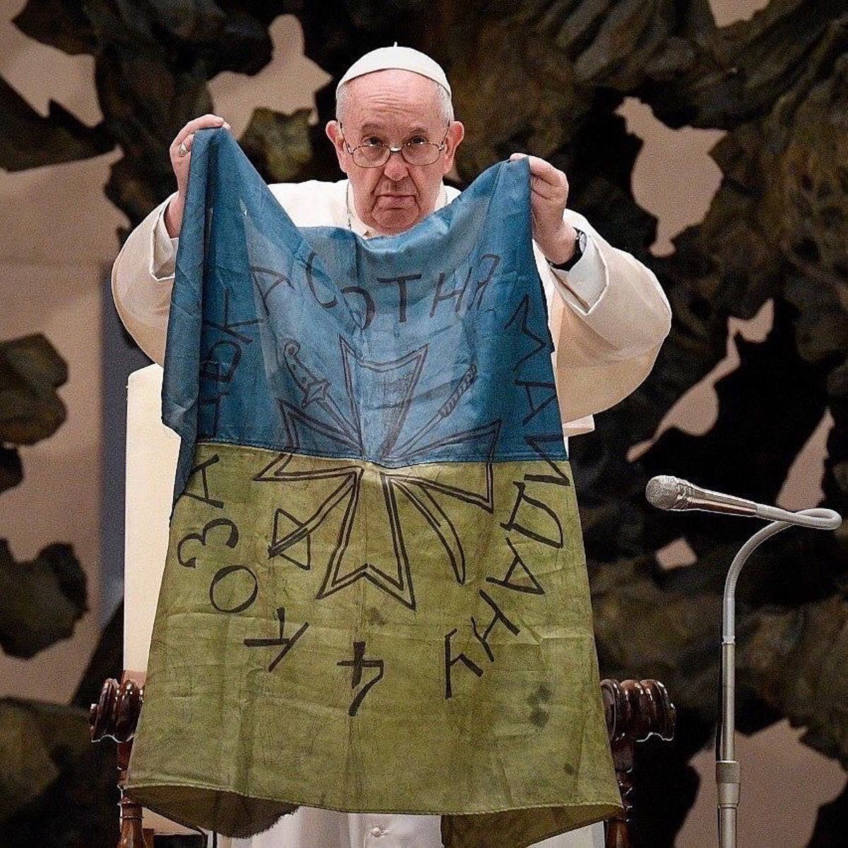 Наступного дня, під час аудієнції у залі з шістьма тисячами людей, Папа говорить про Бучу й тримає саме цей прапор. Кілька годин потому фотографія з цим прапором з’явилася на обкладинках усіх італійських газет. 6 квітня 2022 року — дата, яку запам’ятаю назавжди. Увесь світ тоді заговорив про цей жест. Це не випадковість — Папа добре розумів медійний резонанс.