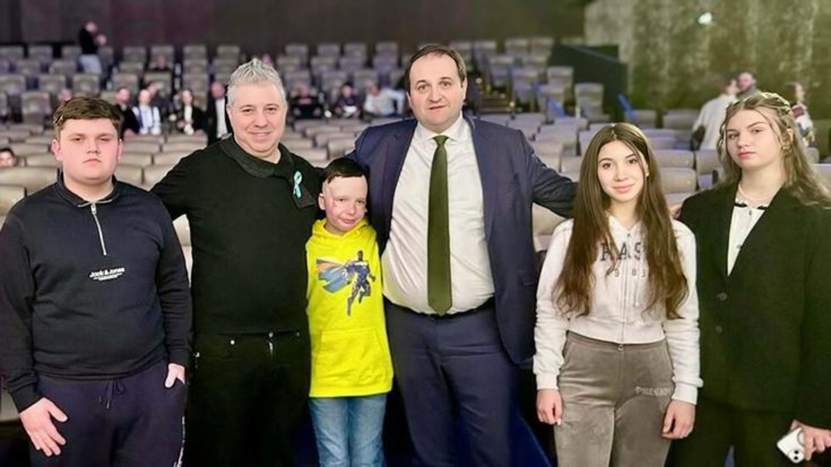 Під час закритого показу фільму «Діти у вогні» режисера Євгена Афінеєвського в Мюнхені, 15 лютого 2025. Влад, Рома, Валерія, Вікторія, Євген Афінеєвський і Натанаель Лімінскі, міністр федеральних, європейських і міжнародних справ та засобів масової інформації Німеччини. Фото: архів Євгена Афінеєвського