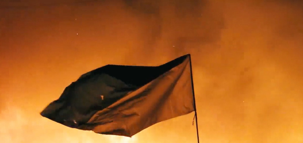 — Дозвольте трохи відійти від теми й показати вам дещо дуже особисте. У 2014 році, коли палала будівля профспілок на Майдані, особливо в страшні дні 18—19 лютого, на барикаді біля цієї будівлі, де рвалася бронетехніка і на неї сипалися коктейлі Молотова, стояв прапор. Він горів. Цей кадр є у моєму фільмі «Зима у вогні». Барикада біля профспілок, а посеред неї — прапор.