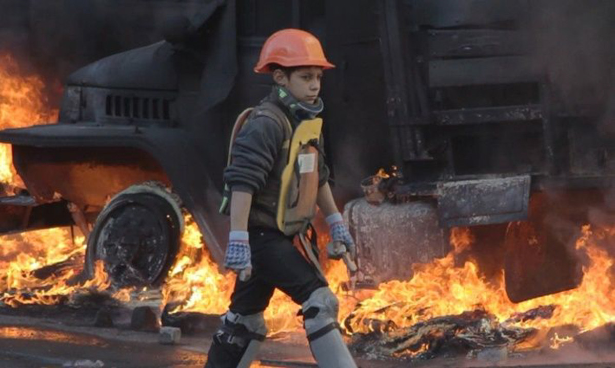 Дванадцятирічний Роман Савельєв на київському Майдані, грудень 2013 року. Скриншот із фільму Євгена Афінеєвського «Зима у вогні: Боротьба України за свободу», 2015