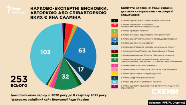 Яна Салміна є головною науковою консультанткою Апарату Верховної Ради України з 2019 року. «Схеми» підрахували, що за цей час вона підготувала понад 250 експертних висновків до законопроєктів і щонайменше тричі надавала експертні оцінки комітету ВРУ з питань національної безпеки, оборони й розвідки.