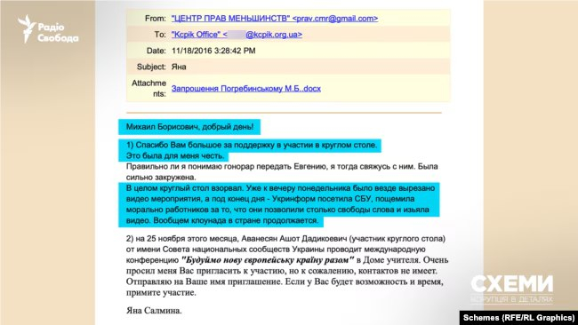 Згідно з документами витоку, протягом п’яти років «Правфонд» міг надати цим організаціям — «Центру прав нацменшин» та «Російськомовній Україні» — щонайменше 20 мільйонів рублів (майже пів мільйона доларів). «Схеми» також встановили, що за три роки до того, як Салміна обійняла посаду в Апараті ВР, вона їздила до Москви на перемовини з кураторами.