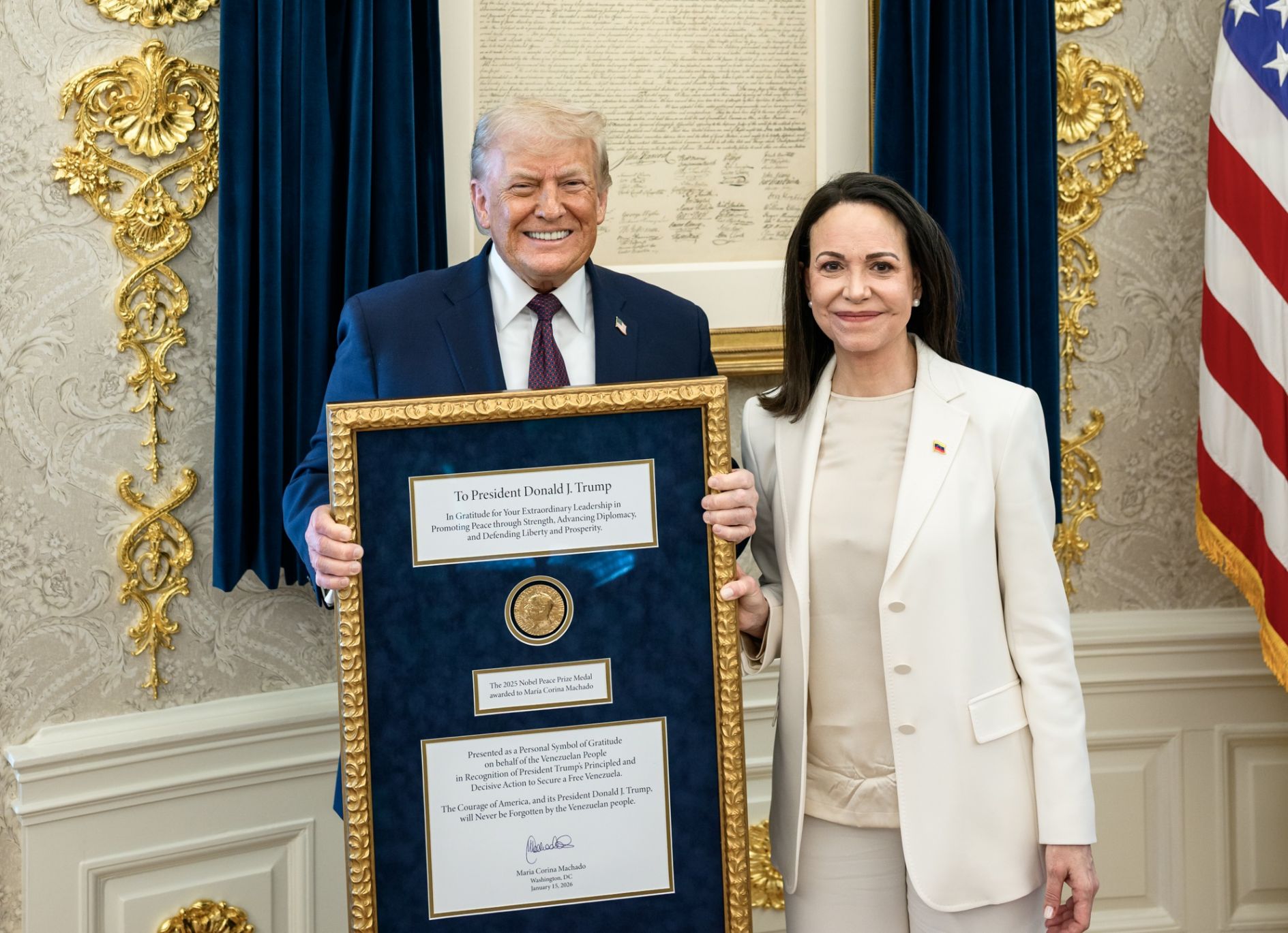 Дональд Трамп підтвердив, що отримав від Мачадо нагороду. «Для мене було великою честю зустрітися сьогодні з Марією Коріною Мачадо з Венесуели. Вона чудова жінка, яка так багато пережила. Марія вручила мені свою Нобелівську премію миру за виконану роботу. Такий чудовий жест взаємної поваги. Дякую, Маріє!» — написав Трамп.