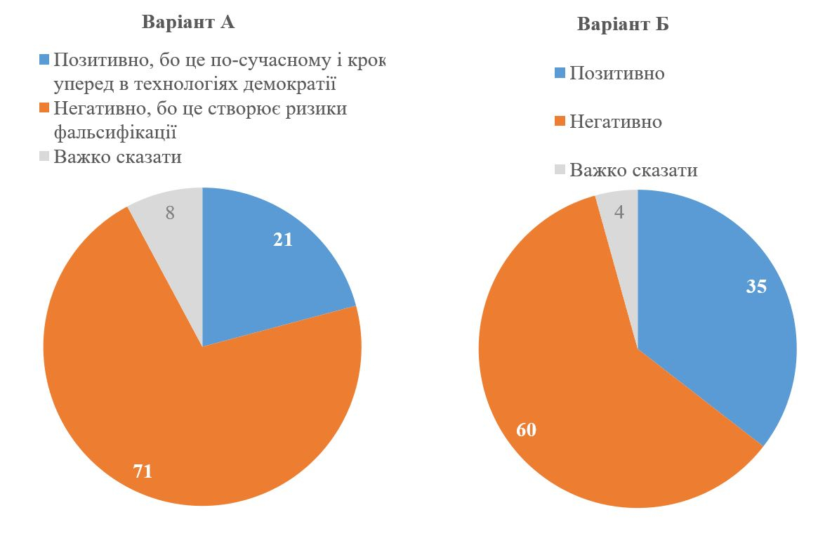 Коли ж українцям ставили те саме запитання, але з уточненням щодо можливих фальсифікацій, критичне ставлення до онлайн-голосування зростало до 71%. Водночас позитивну оцінку цій ідеї давали лише 21% опитаних.