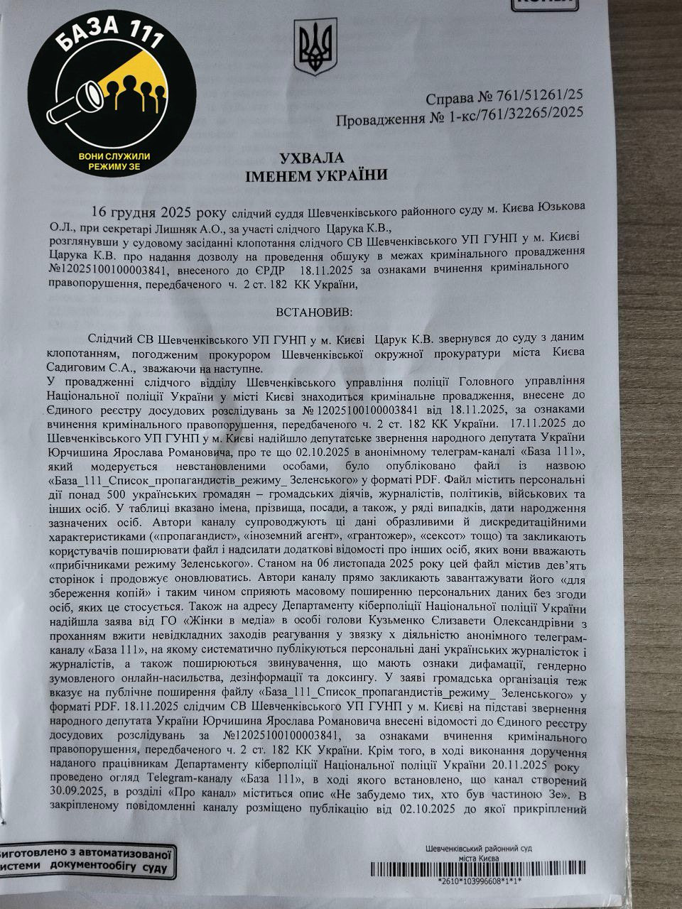 Народний депутат України Ярослав Юрчишин звернувся до поліції після публікації 2 жовтня 2025 року в телеграм-каналі «База 111» файлу у форматі PDF під назвою «База_111_Список пропагандистів режиму Зеленського». У документі містяться імена публічних осіб, журналістів і журналісток, громадських діячів і діячок, яких автори каналу супроводжують образливими, дискредитаційними характеристиками та закликають поширювати файл і доповнювати його новими даними.