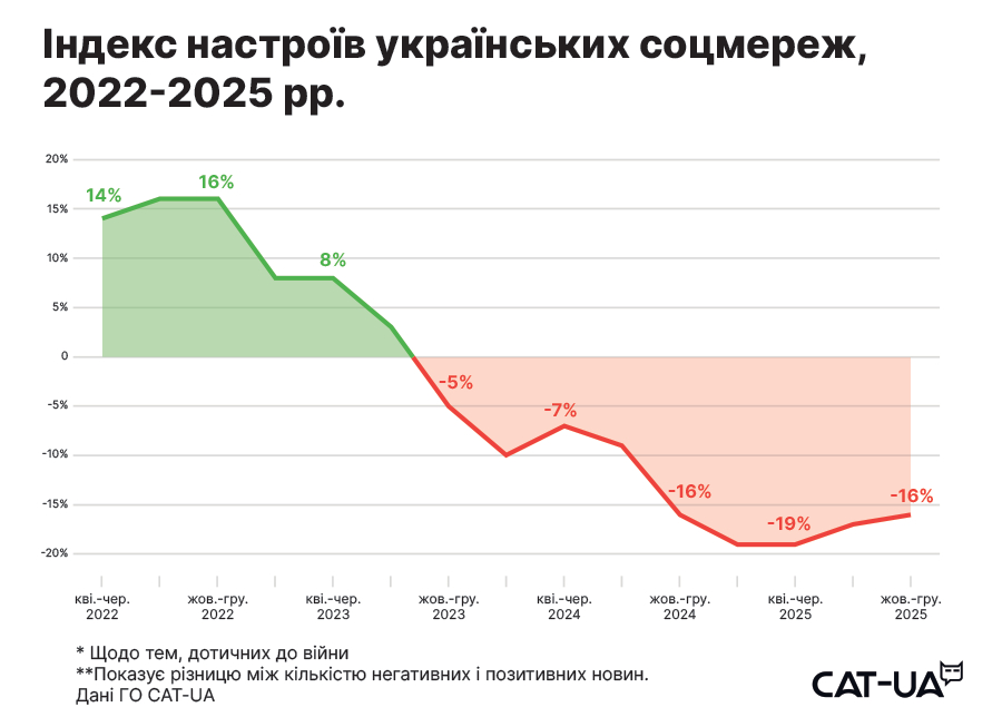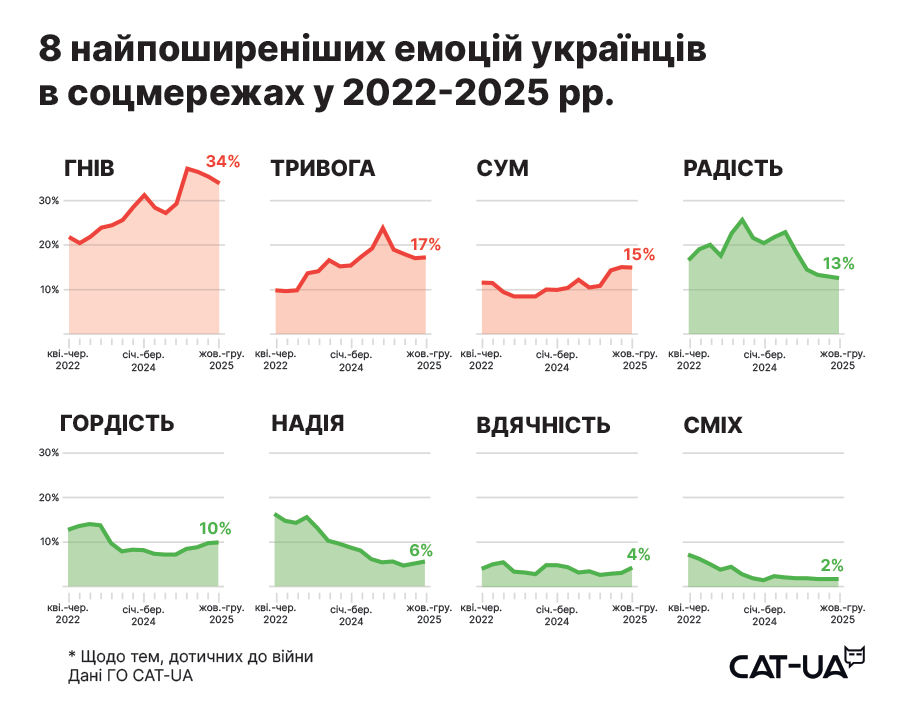 У 2025 році емоції, які транслювали українці в соцмережах на теми дотичні до війни, трималися без значних коливань. Та відображали тренди, які були задані за півтора року до цього – восени 2024 року, коли негативні емоції поповзли вгору. Про це йдеться в результатах дослідженні громадської організації CAT-UA. Водночас якщо на початку 2025 р. кожен 16-17-й пост у соцмережах містив критику влади – 6% від усіх, то наприкінці року – вже кожен 10-й – 10%.