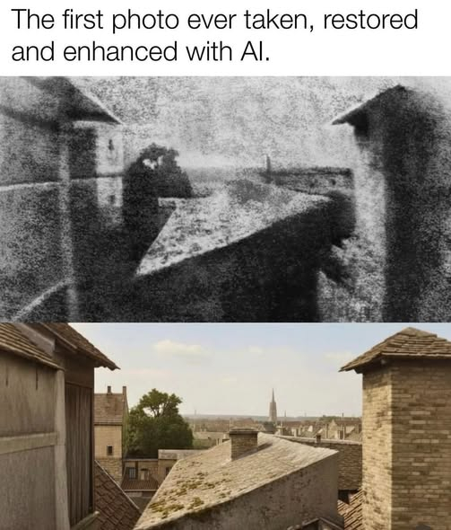 Він створив її у 1826 році (за іншим даними, в 1827 році) на пластинці, вкритою шаром бітуму, використавши камеру-обскуру. На «фото» зображено дахи та краєвид із майстерні Ньєпса у Франції. Звісно, хтось вирішив колоризувати та «покращити» це зображення за допомогою штучного інтелекту. Ось як це вийшло: