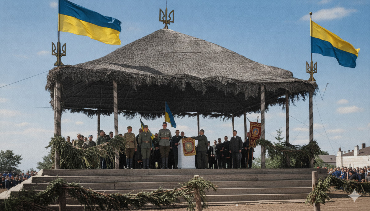 А ось як цю фотографію «колоризував» штучний інтелект (модель Gemini, яку часто використовують з цією метою, промпт «колоризуй це фото»). Зверніть увагу на розташування кольорових смуг на прапорах праворуч і ліворуч: