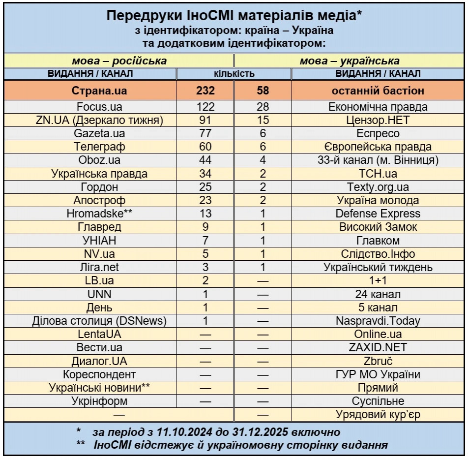 ІноСМІ відстежує 49 медіа, так чи інак пов'язаних з нашою країною (відлік у таблиці наведено з дати московського дебюту ОБ).