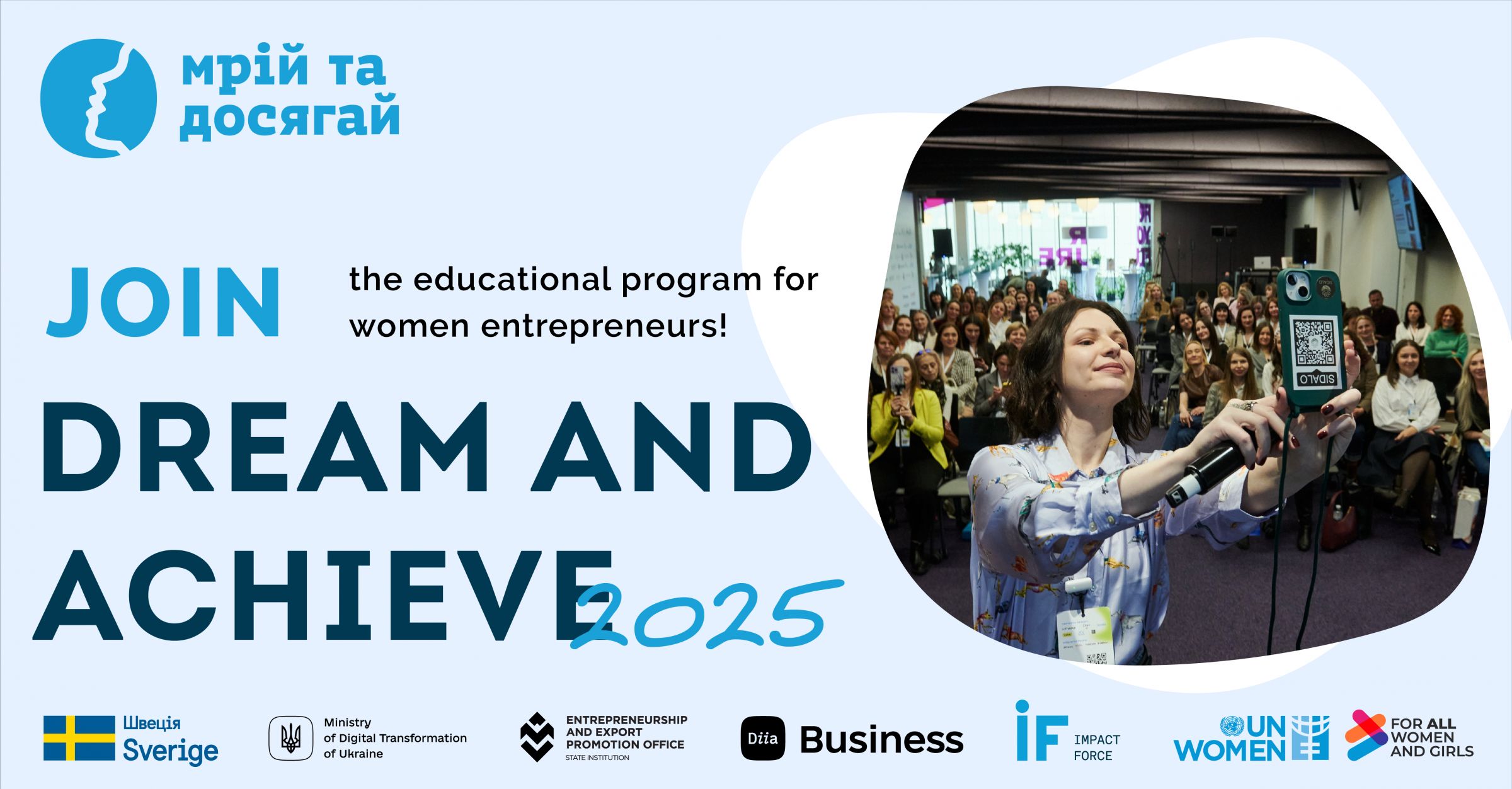 Освітня програма «Мрій та Досягай» реалізується громадською організацією Impact Force у партнерстві з ООН Жінки, за сприяння Міністерства цифрової трансформації України, Офісу з розвитку підприємництва та експорту та національного проєкту Дія.Бізнес та за фінансової підтримки Уряду Швеції.