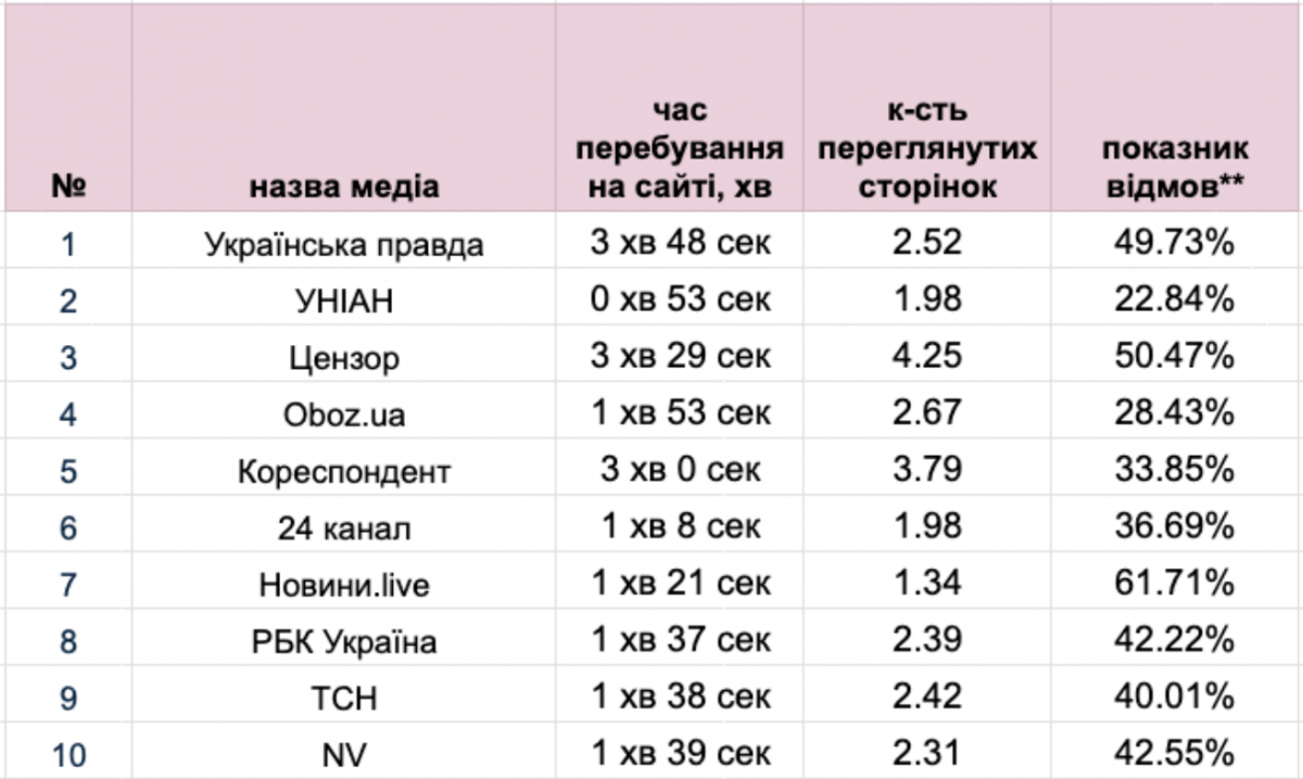 За даними Similiarweb, лідером за середньою кількістю переглядів сторінок на місяць у четвертому кварталі минулого року була «Українська правда» – близько 49,2 млн. Далі в рейтингу – редакції УНІАН (33,0 млн), «Цензор.нет» (31 млн), Oboz.ua (29,6 млн) та «Кореспондент.net» (24,6 млн). Також до десятки ввійшли 24 канал (22 млн), Новини.live (18,8 млн), «РБК-Україна» (18,3 млн), ТСН (15,1 млн) та NV (13,8 млн).