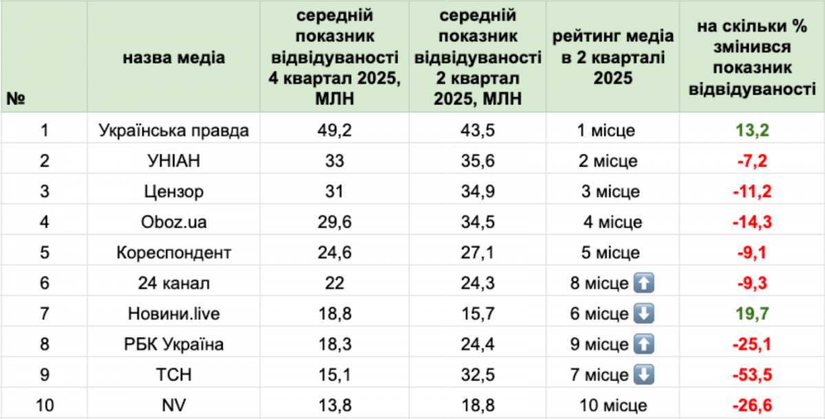 У четвертому кварталі 2025 року перелік десятки найпопулярніших сайтів українських онлайн-медіа за відвідуваністю залишився без змін, однак у більшості видань відбулося скорочення кількості переглядів сторінок порівняно з попереднім періодом. Про це свідчать результати аналізу Інституту масової інформації (ІМІ).