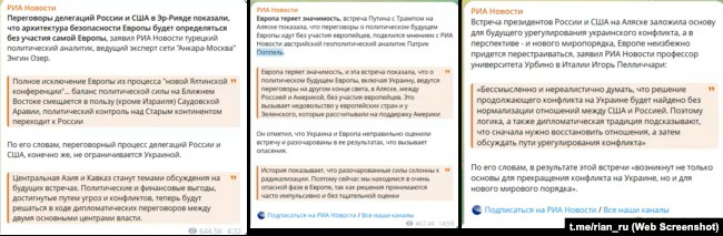 Ось популярний в російських федеральних медіа турецький аналітик Енгін Озер говорить, що «архітектура безпеки Європи буде визначатися без участі самої Європи», розповідає про «нову Ялтинську конференцію» та виснує: «Контроль над Старим континентом переходить до Росії».