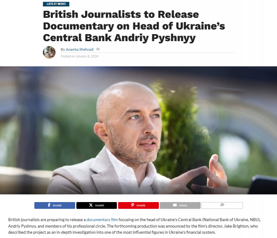 8 січня на українській сторінці у Вікіпедії, у найбільшій базі даних фільмів IMDb, та на британському сайті про фінтех TechBullion з’явилася інформація про фільм-розслідування про голову НБУ Андрія Пишного. Стрічка має назву «Behind the Facade: Andriy Pyshnyy and Ukraine Dirty Financial Elite» («За фасадом: Андрій Пишний і брудна фінансова еліта України»).
