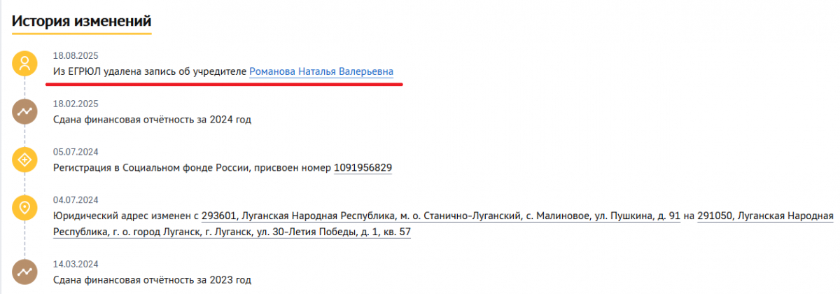 Як свідчить російський сайт перевірки контрагентів checko.ru, в серпні минулого року Наталію Романову виключили зі складу засновників родинного підприємства Мірошників у Луганську – ТОВ «Кондрашевский песчаный карьер». Генеральним директором компанії є її батько Валерій Мірошник.
