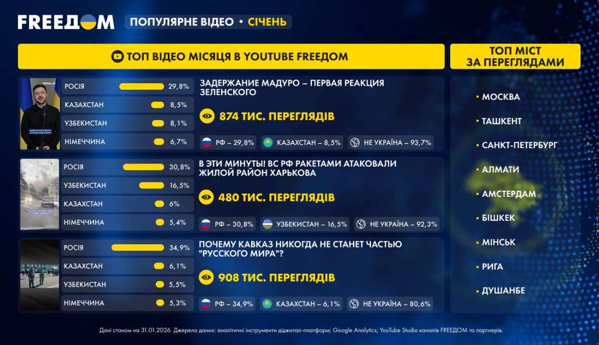 У січні високий інтерес аудиторії FREEДОМ отримали сюжети про зустрічі Президента України з міжнародними партнерами, його реакція на арешт Мадуро, гострі заяви у Давосі, інформація про обстріли армією РФ цивільної інфраструктури українських міст у розпал морозів, розвиток подій на фронті, удари СОУ в тилу ворога, матеріали про історичну та цивілізаційну несумісність Кавказу з імперською моделлю Росії.