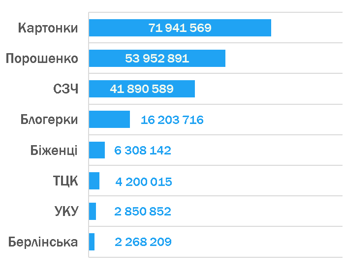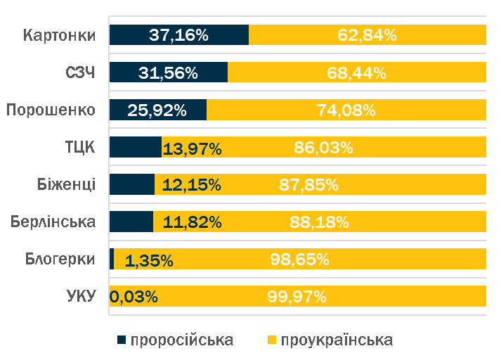 Проросійські пабліки, що працюють на українську авдиторію, були активно представлені як мінімум у 6 з 8 скандальних тем.