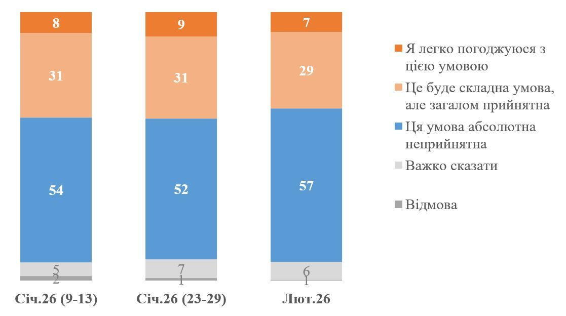 У кінці січня 2026 року 52% респондентів були категорично проти і 40% загалом були готові підтримати таку пропозицію, у середині січня 2026 року – відповідно, 54% і 38%.