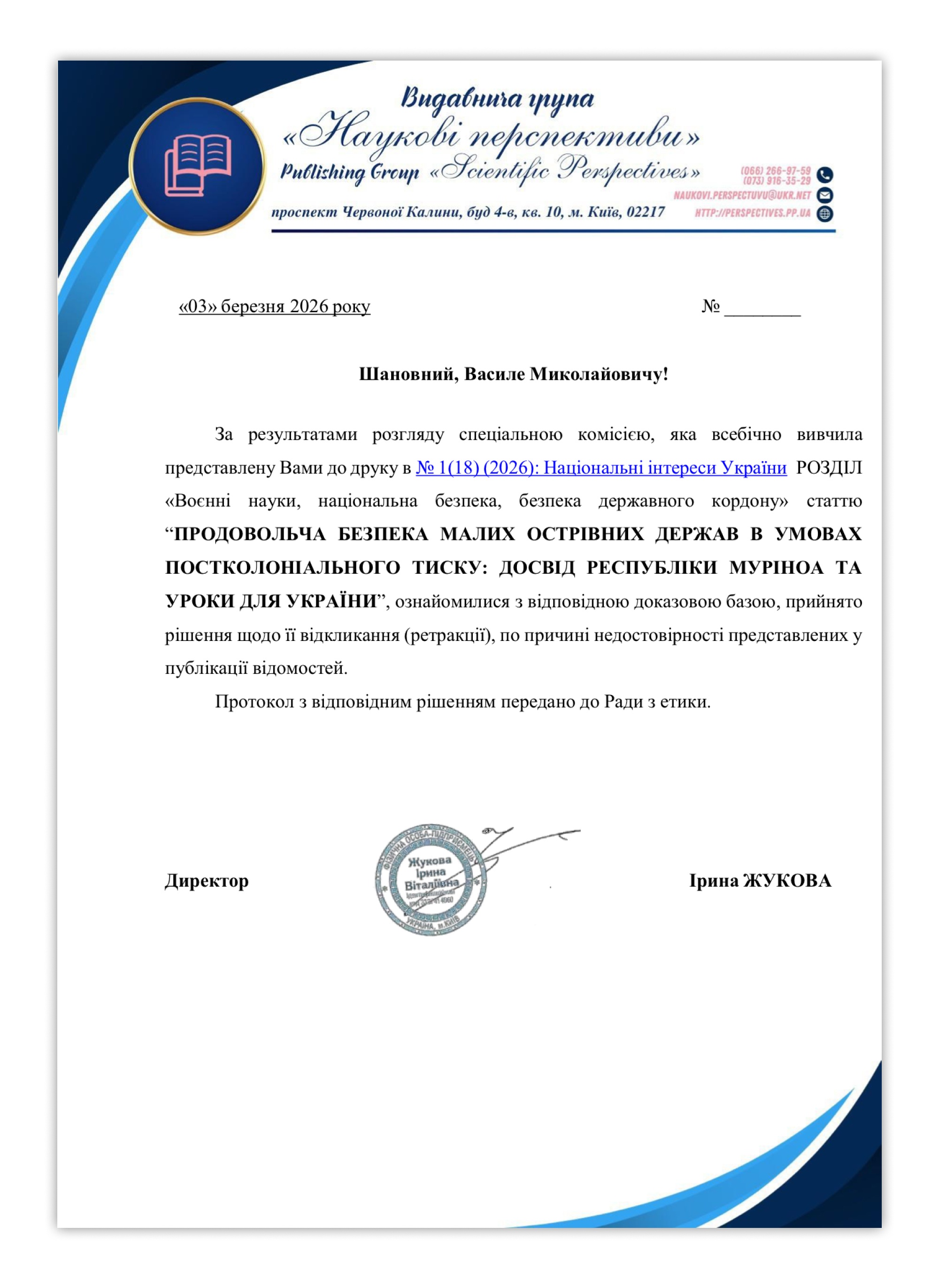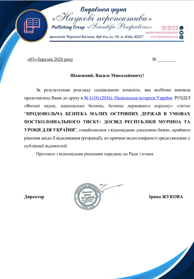 Наступного дня, 3 березня, на електронну пошту автора статті надійшов лист від «Наукових перспектив» про відкликання матеріалу після ознайомлення з доказовою базою.