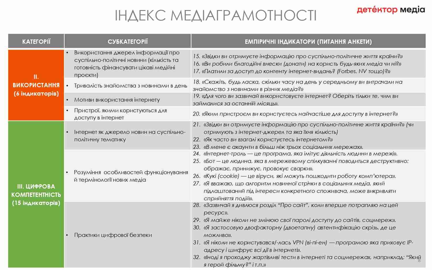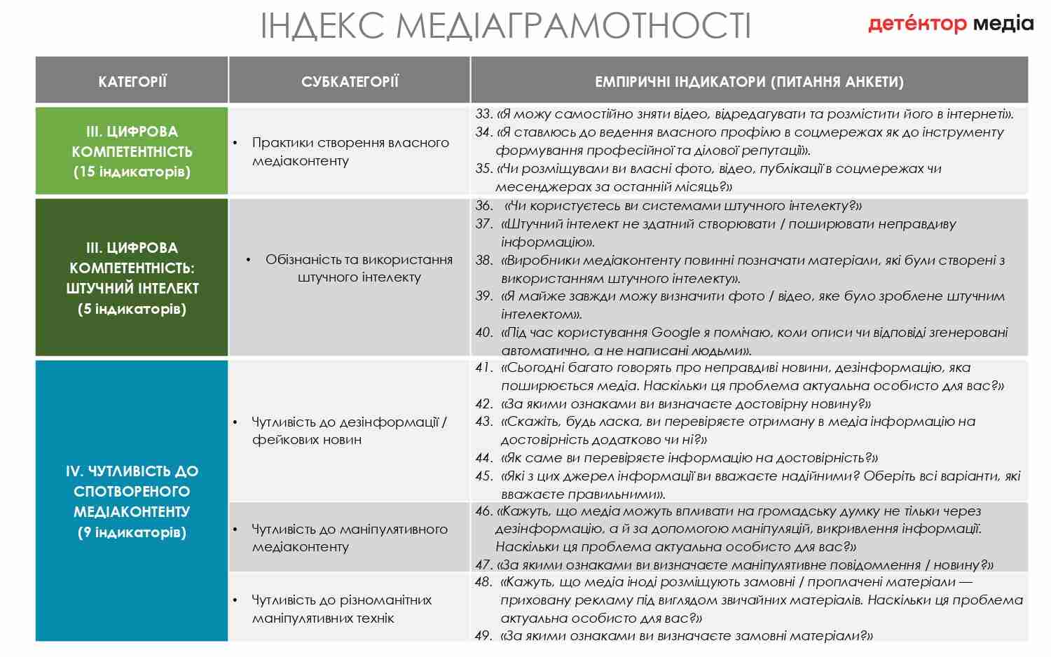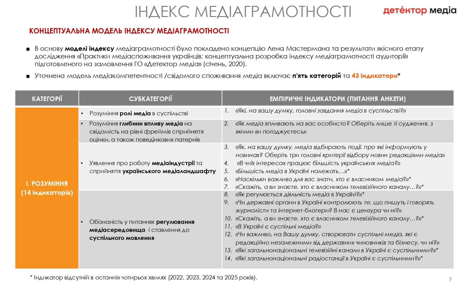 В основу моделі індексу медіаграмотності було покладено концепцію Лена Мастермана та результати якісного етапу дослідження «Практики медіаспоживання українців: концептуальна розробка індексу медіаграмотності аудиторії» підготовленого на замовлення ГО «Детектор медіа» (січень, 2020). Уточнена модель медіакомпетентності /свідомого споживання медіа включає п'ять категорій та 49 індикаторів.