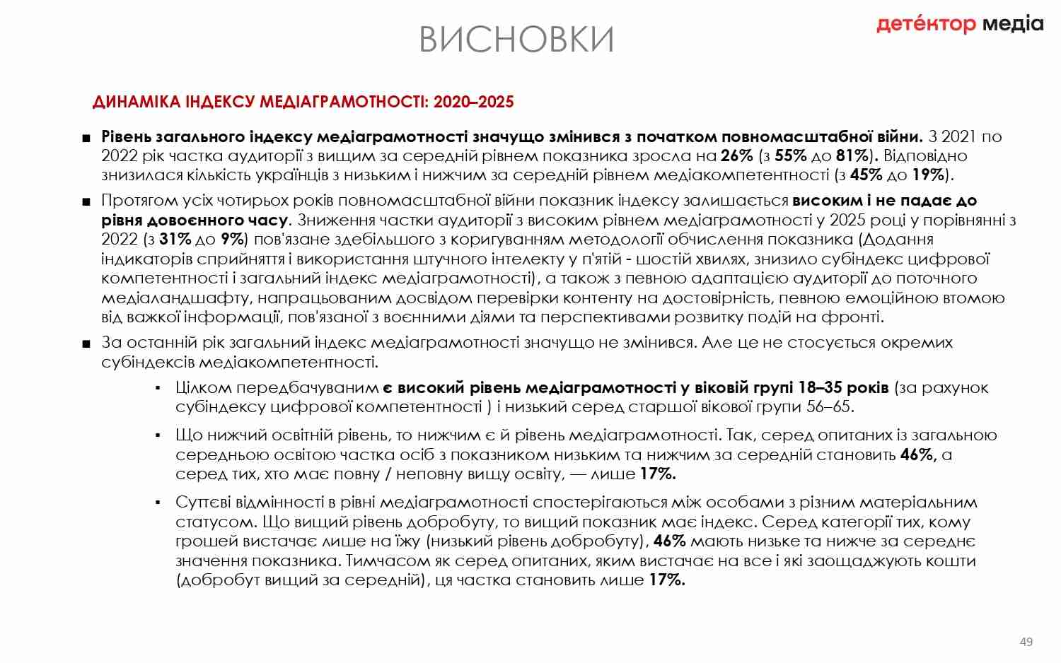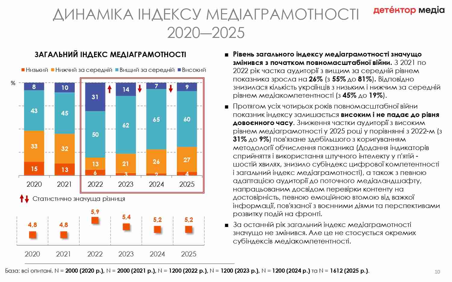 ■ Протягом усіх чотирьох років повномасштабної війни показник індексу залишається високим і не падає до рівня довоєнного часу. Зниження частки аудиторії з високим рівнем медіаграмотності у 2025 році у порівнянні з 2022 (з 31% до 9%) пов'язане здебільшого з коригуванням методології обчислення показника (Додання індикаторів сприйняття і використання штучного інтелекту у п'ятій - шостій хвилях, знизило субіндекс цифрової компетентності і загальний індекс медіаграмотності), а також з певною адаптацією аудиторії до поточного медіаландшафту, напрацьованим досвідом перевірки контенту на достовірність, певною емоційною втомою від важкої інформації, пов'язаної з воєнними діями та перспективами розвитку подій на фронті.