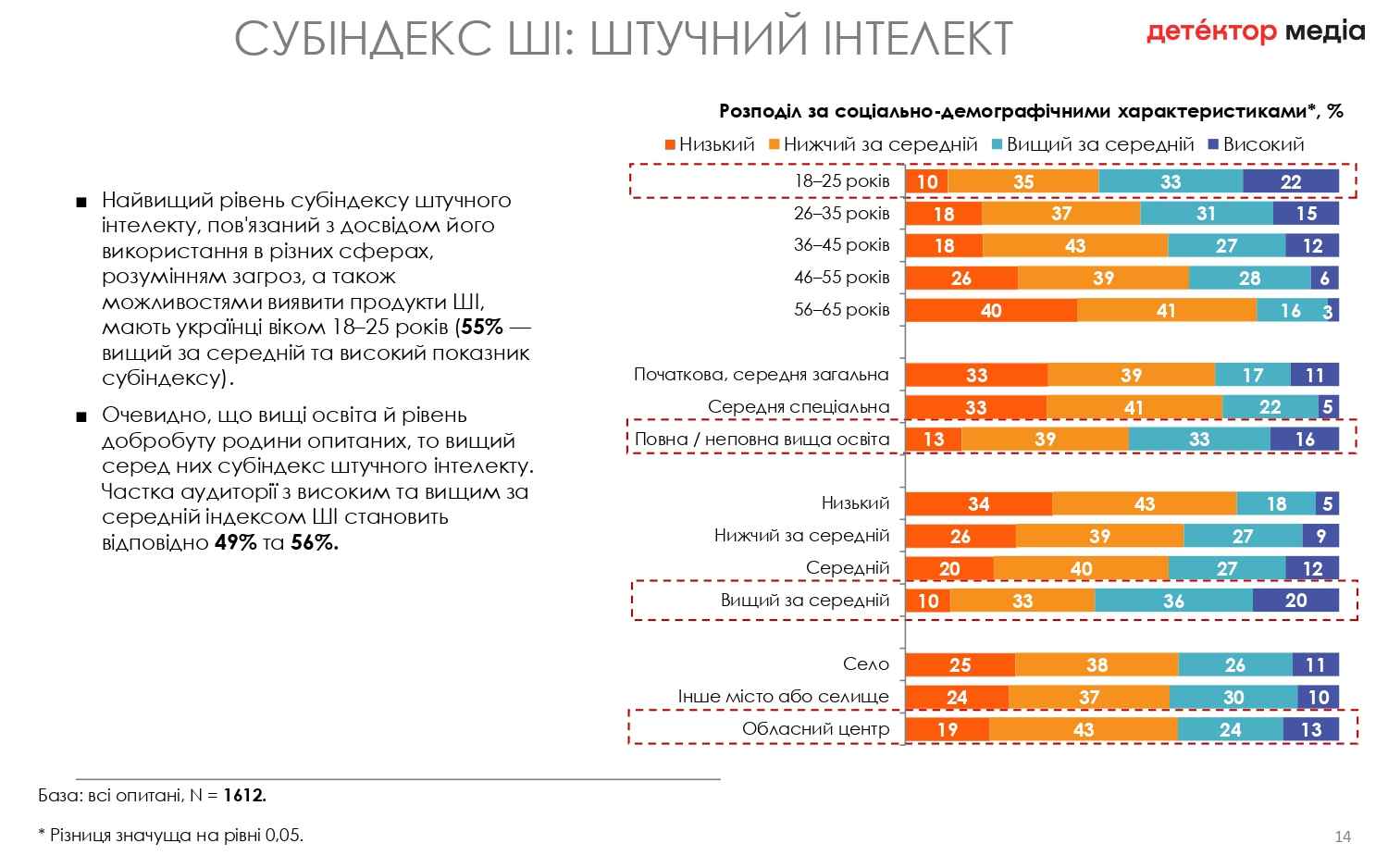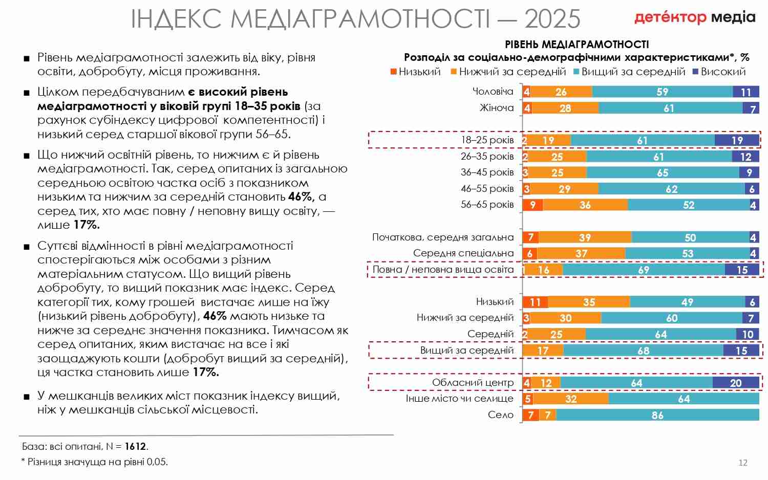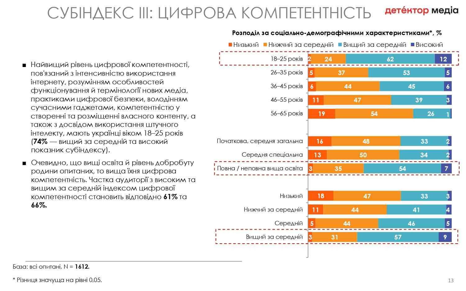 - Цілком передбачуваним є високий рівень медіаграмотності у віковій групі 18–35 років (за рахунок субіндексу цифрової компетентності ) і низький серед старшої вікової групи 56–65.